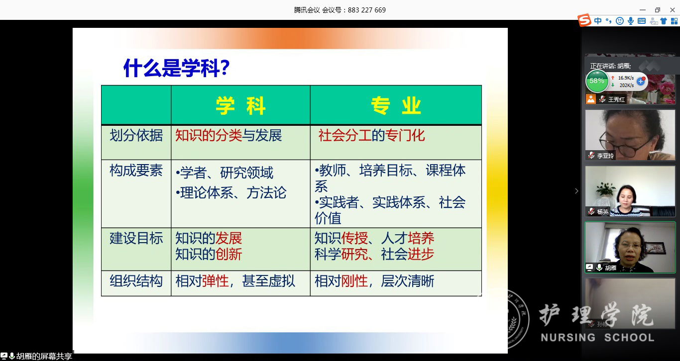 胡雁教授从什么是学科、学科建设的五大要素、国际国内护理学科发展概况、护理专业学位和科学学位的比较、护理硕士专业学位人才在护理学科建设中的意义、强化护理硕士专业学位研究生临床能力培养及注重护理硕士专业学位研究生临床能力的综合考核等几个方面给大家做了精准的介绍。复旦大学美加墨世界杯官方网站作为全国最早开展护理硕士专业学位研究生培养的高校之一,经过10余年的不断实践和经验总结,在取得学科建设稳步发展的基础上,护理专硕研究生的培养成绩斐然,曾获得“全国第一届医药学研究生教育成果奖”一等奖。