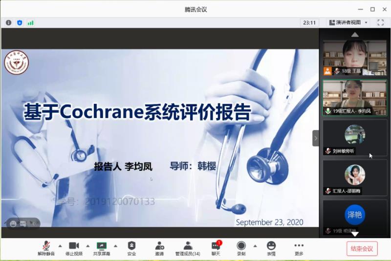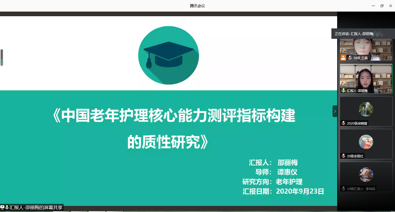 本次读书报告会由2018级老年保健与护理方向研究生王晶主持。读书报告会分为研究生汇报和师生点评两个部分进行。首先由2019级研究生李均凤、邵丽梅、唐帆3位同学以PPT的形式进行分享。随后参会老师和同学对3位同学的汇报逐一进行点评,为学生提出建设性意见,提供专业性指导,展开讨论交流。