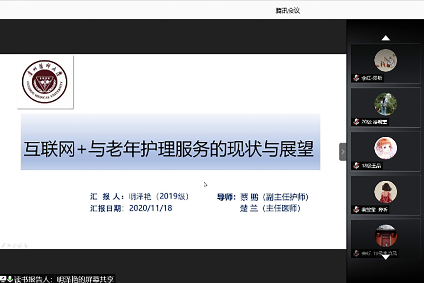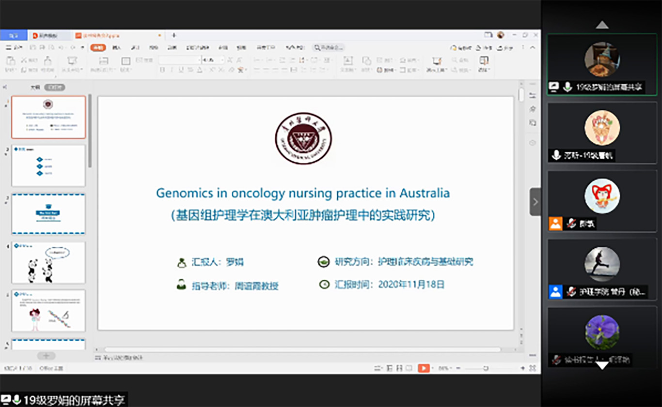 首先由2019级研究生罗娟、明泽艳以PPT的形式进行汇报。罗娟汇报了《基因组护理学在澳大利亚肿瘤护理中的实践研究》,从研究目的及设计、研究对象、研究结果、研究结论等方面结合基础医学知识和基因组研究热点展开论述,为今后的护理研究提供新思路及方法。明泽汇报了《“互联网+”与老年护理服务的现状与展望》,根据2019年2月国家卫生健康委办公厅关于开展“互联网+护理服务”试点工作的通知,结合“互联网+”和“老年护理”进行综述汇报,并提出对未来的“互联网+”护理服务的思考。