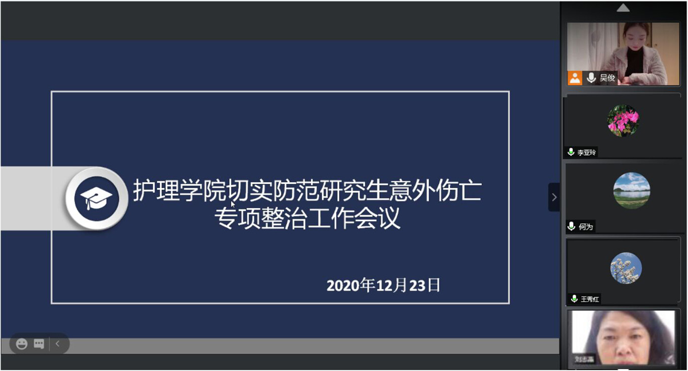12月23日晚,为认真贯彻落实党中央和省委、省政府、省教育厅的重要批示精神,预防和减少研究生意外伤害事故的发生,按照美加墨世界杯官方网站党委研究生工作部和学校下发文件。在腾讯会议上召开关于美加墨世界杯官方网站防范研究生意外伤亡专项整治工作的会议。该会议由美加墨世界杯官方网站2020级辅导员吴俊主持,党委委员、院长李亚玲,党委委员、副书记何为,党委委员、副院长王秀红以及全体研究生意外伤亡专项工作小组成员参加。
