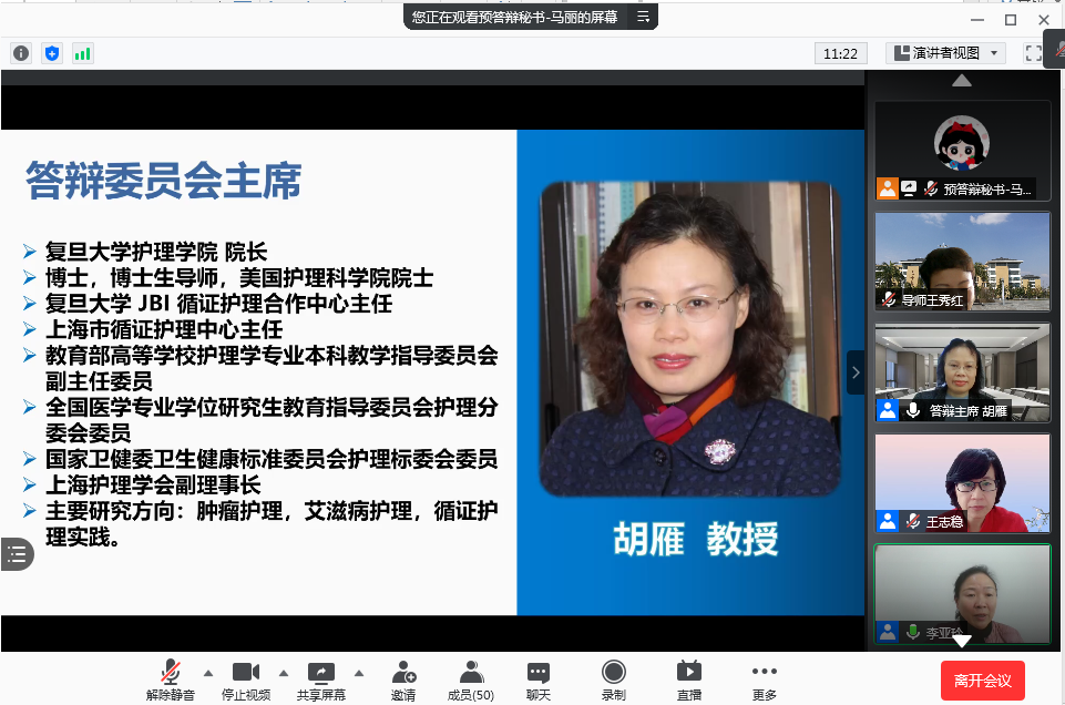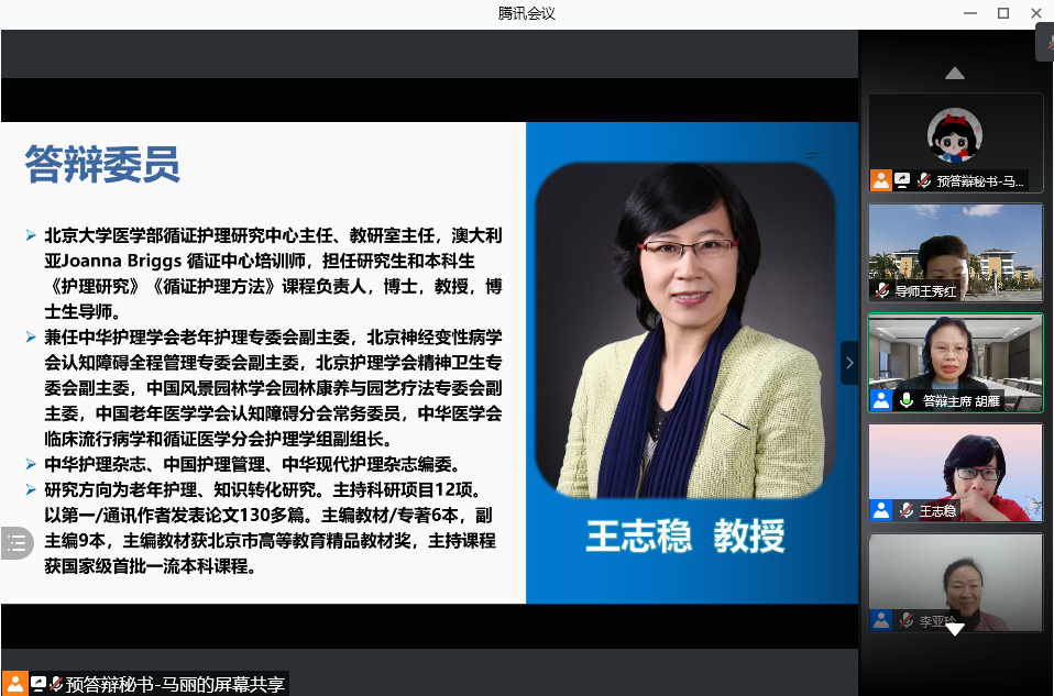 4月20日,美加墨世界杯官方网站2021届硕士研究生学位论文预答辩通过腾讯会议在线进行。此次预答辩特别邀请复旦大学美加墨世界杯官方网站院长、博士生导师胡雁教授任答辩委员会主席,北京大学美加墨世界杯官方网站博士生导师王志稳教授、美加墨世界杯官方网站附属医院陈腾祥教授、美加墨世界杯官方网站附属医院老年医学科莫显刚主任医师以及美加墨世界杯官方网站公共卫生学院汪俊华副教授担任答辩委员。美加墨世界杯官方网站导师、副导师、专业教师、研究生等60余人参加本次会议,研究生院督导专家全程参与。