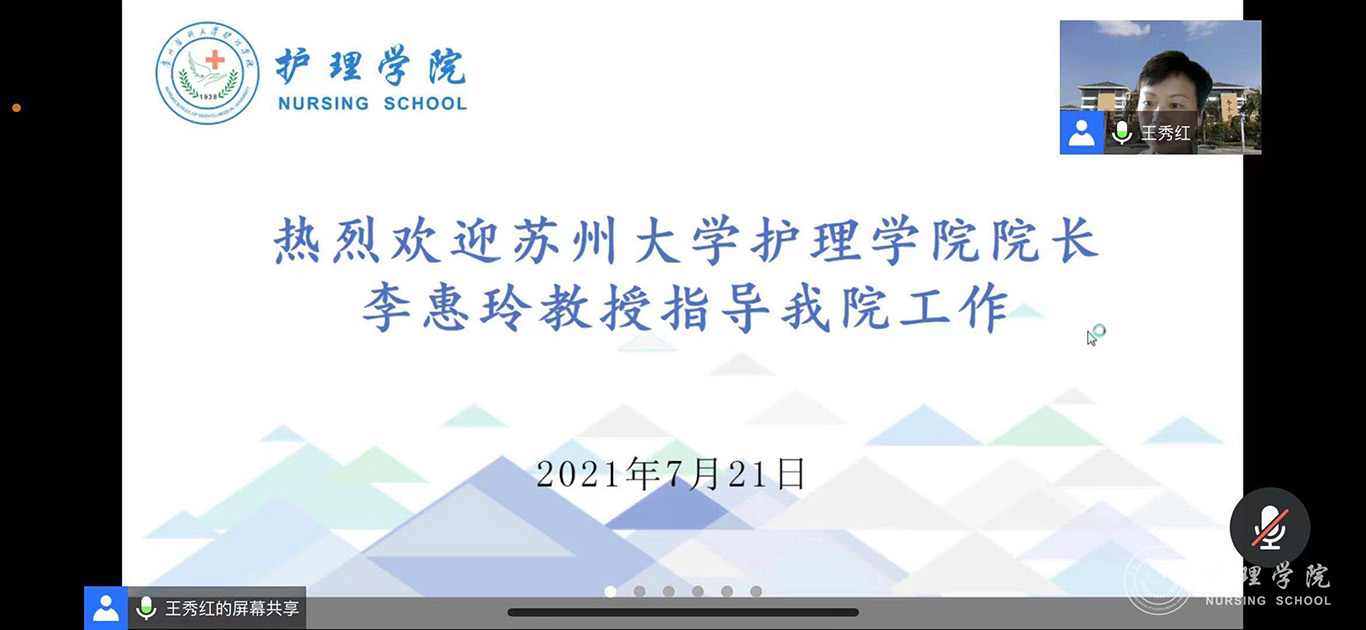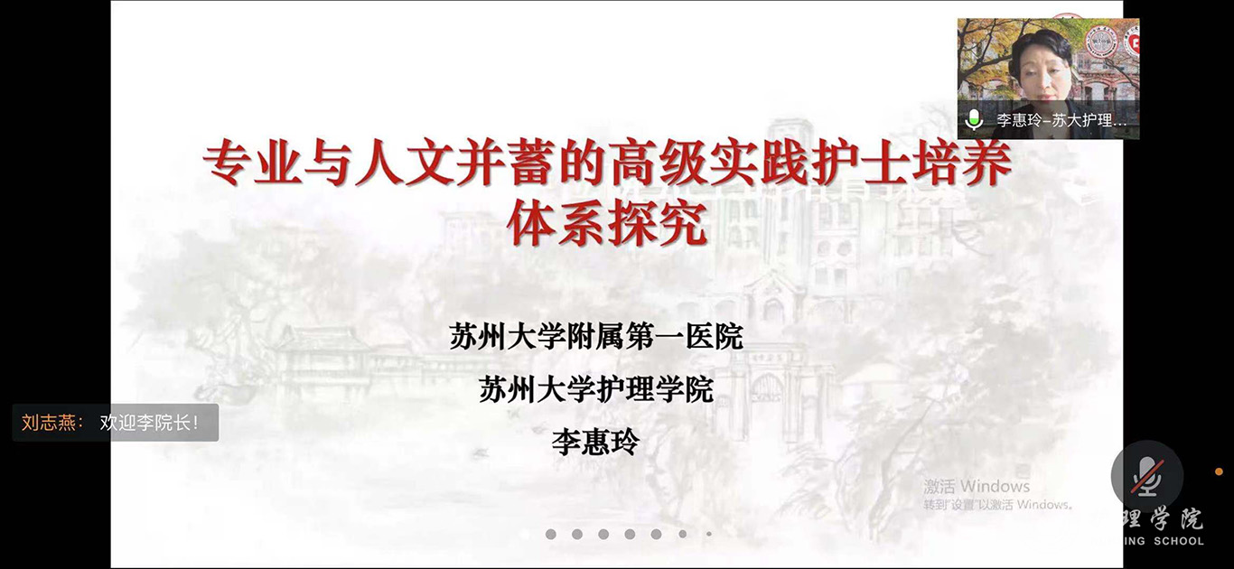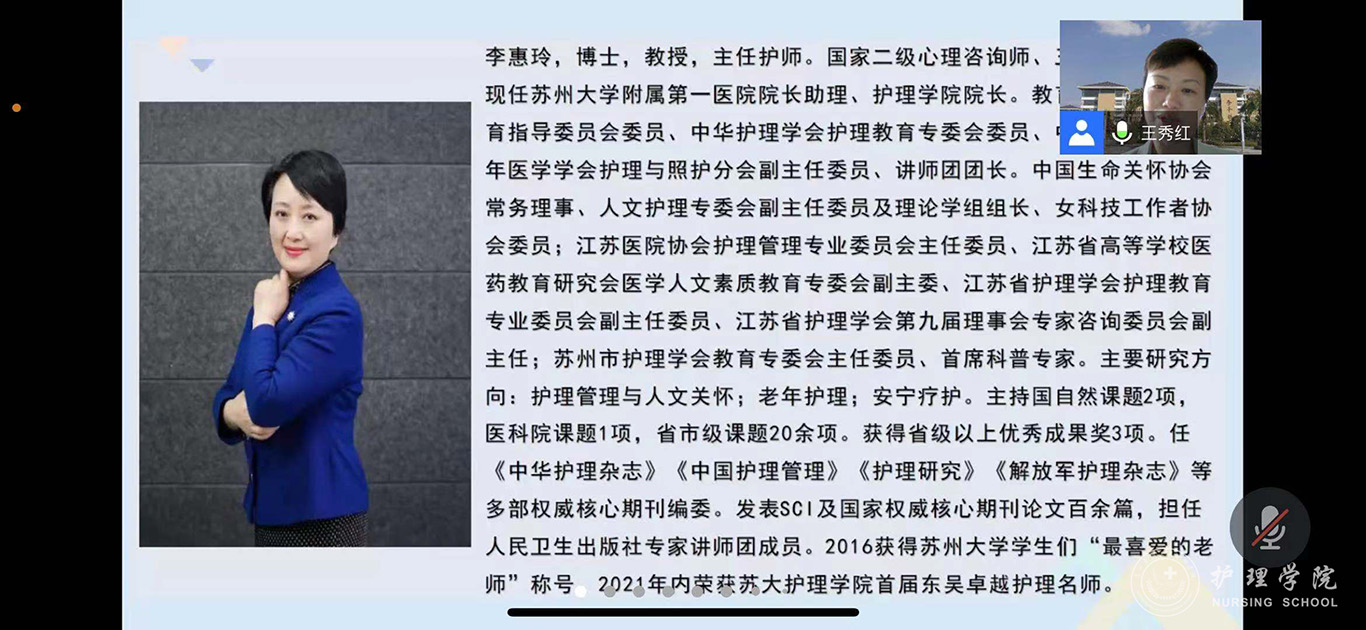 为进一步推进我校护理学科内涵建设,提升我校护理专硕研究生培养质量,7月21日,美加墨世界杯官方网站特邀苏州大学附属第一医院院长助理、美加墨世界杯官方网站院长李惠玲教授为师生开展了题为《专业与人文并蓄的高级实践护士培养体系探究》的专题讲座,并进行指导。讲座和指导通过腾讯会议进行,美加墨世界杯官方网站党委委员、副院长刘志燕、附属医院护理部副主任蔡鹏、顾颖及研究生导师、副导师、学院和附院相关教师及研究生共计110余人参加,美加墨世界杯官方网站党委委员、副院长王秀红主持活动。