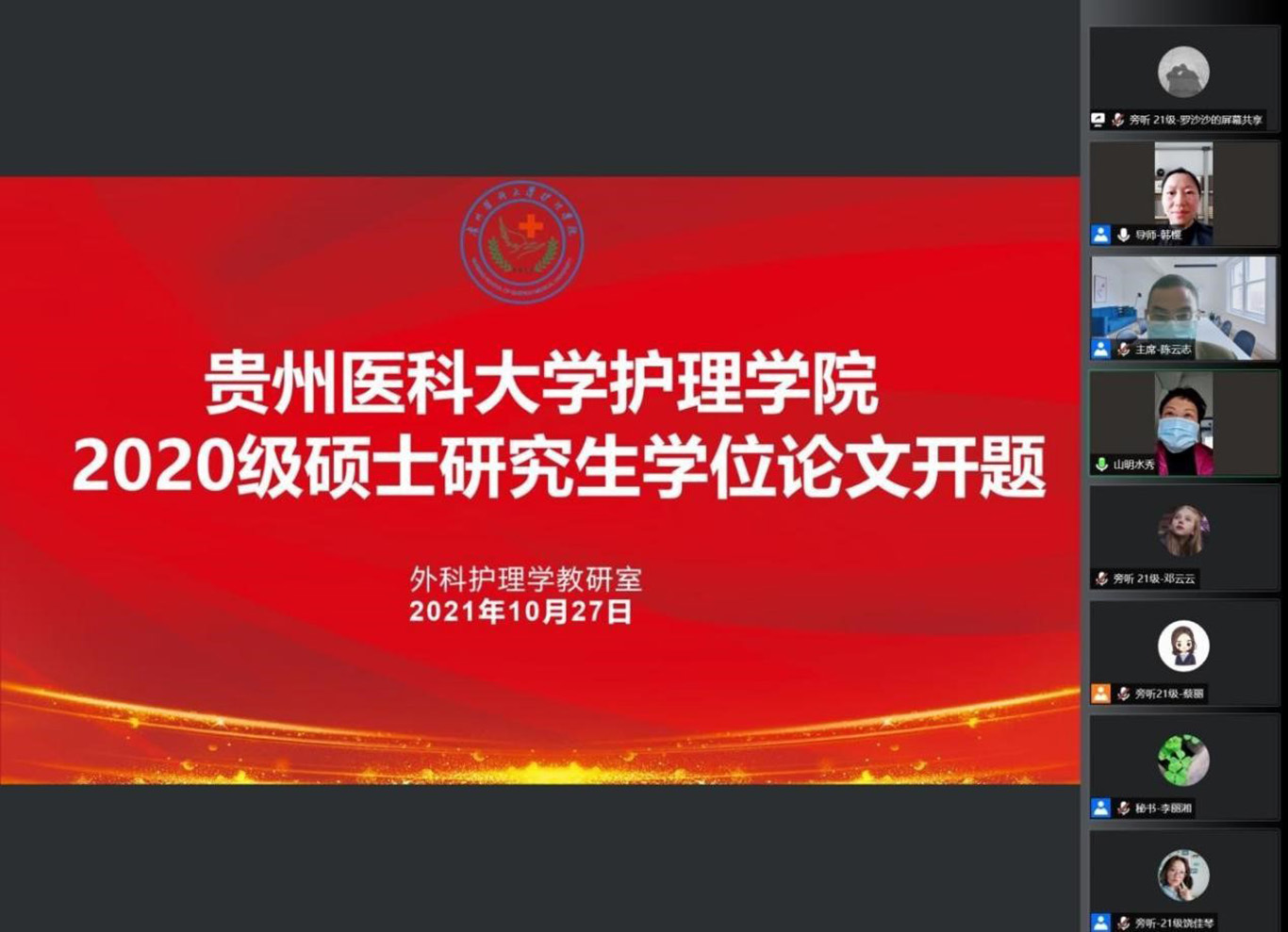 10月26日、27日、29日美加墨世界杯官方网站2020级硕士研究生开题通过腾讯会议在线进行。此次开题分别邀请中南大学湘雅美加墨世界杯官方网站郭佳教授、刘民辉副教授及贵州中医药大学陈云志教授任开题委员会主席;北京大学美加墨世界杯官方网站王志稳教授、 中南大学湘雅三医院健康管理中心秦春香教授、中南大学湘雅美加墨世界杯官方网站杨敏教授、孙枚副教授和王瑶副教授及《护士进修杂志》主编张秀主任、中山大学中山眼科中心肖惠明主任护师、华北理工大学护理与康复学院陈长香教授、广州市护理学会会长黄雪仪主任护师、贵州中医药大学美加墨世界杯官方网站石国凤教授、美加墨世界杯官方网站公共卫生学院流行病学与卫生统计学王子云副教授和汪俊华副教授等担任开题专家委员。美加墨世界杯官方网站导师、副导师、专业教师、研究生等共计参会150人次,研究生院督导专家全程参与。