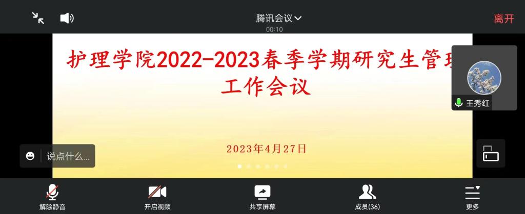 分管副院长王秀红结合学校研究生管理工作会议精神主要从新校区搬迁、研究生毕业情况和就业进展、研究生安全稳定、研究生培养计划执行及开题、答辩、临床实践终末考核等近期7个块面重点工作作了安排和说明,要求教研室和导师提前谋划、统筹推进,并协同研究生辅导员加强研究生的日常管理、心理健康等工作,齐抓共管,推进学院研究生培养工作高质量发展。
