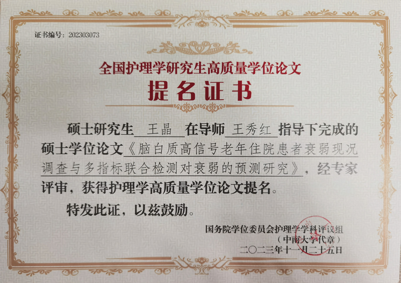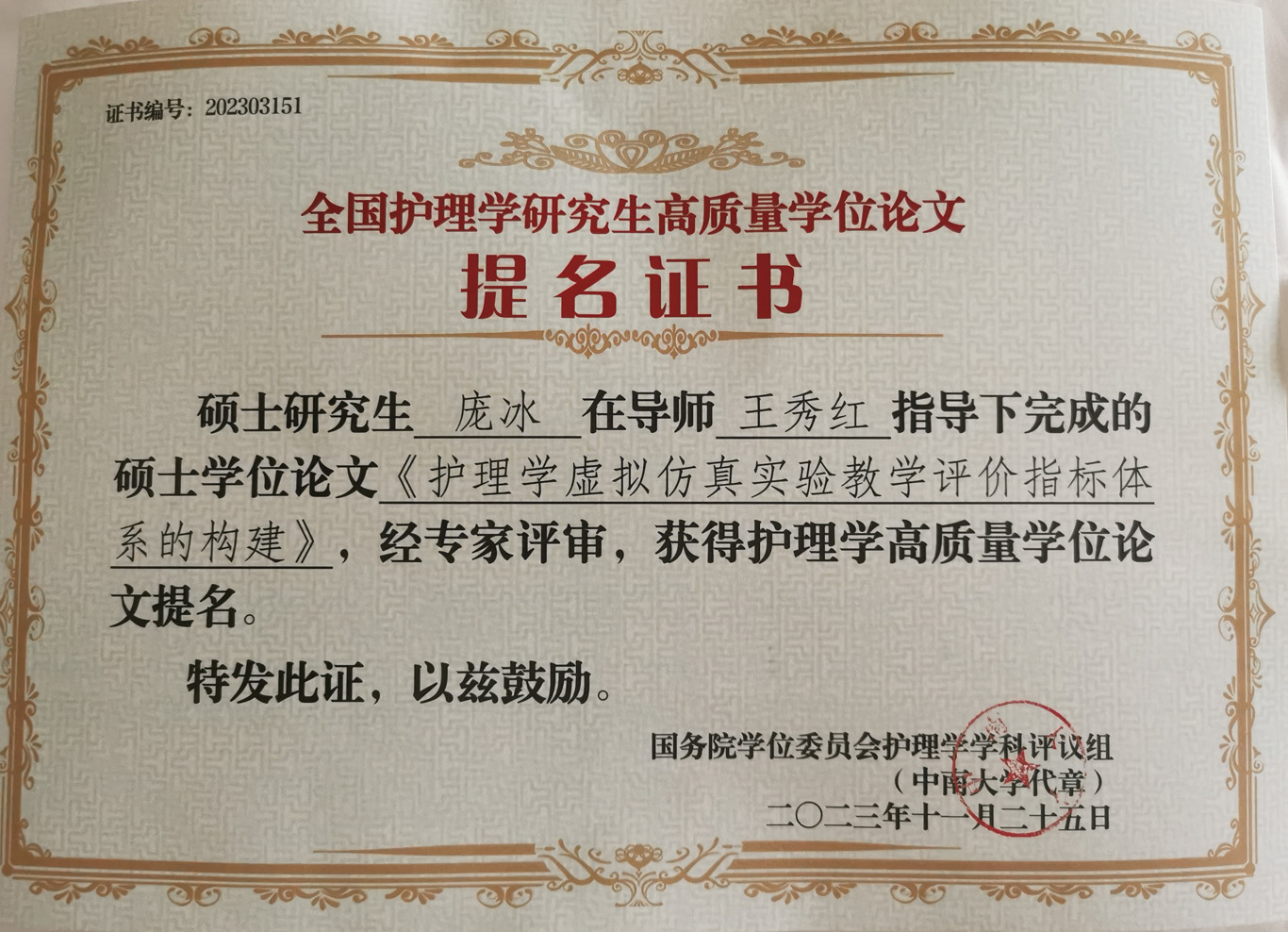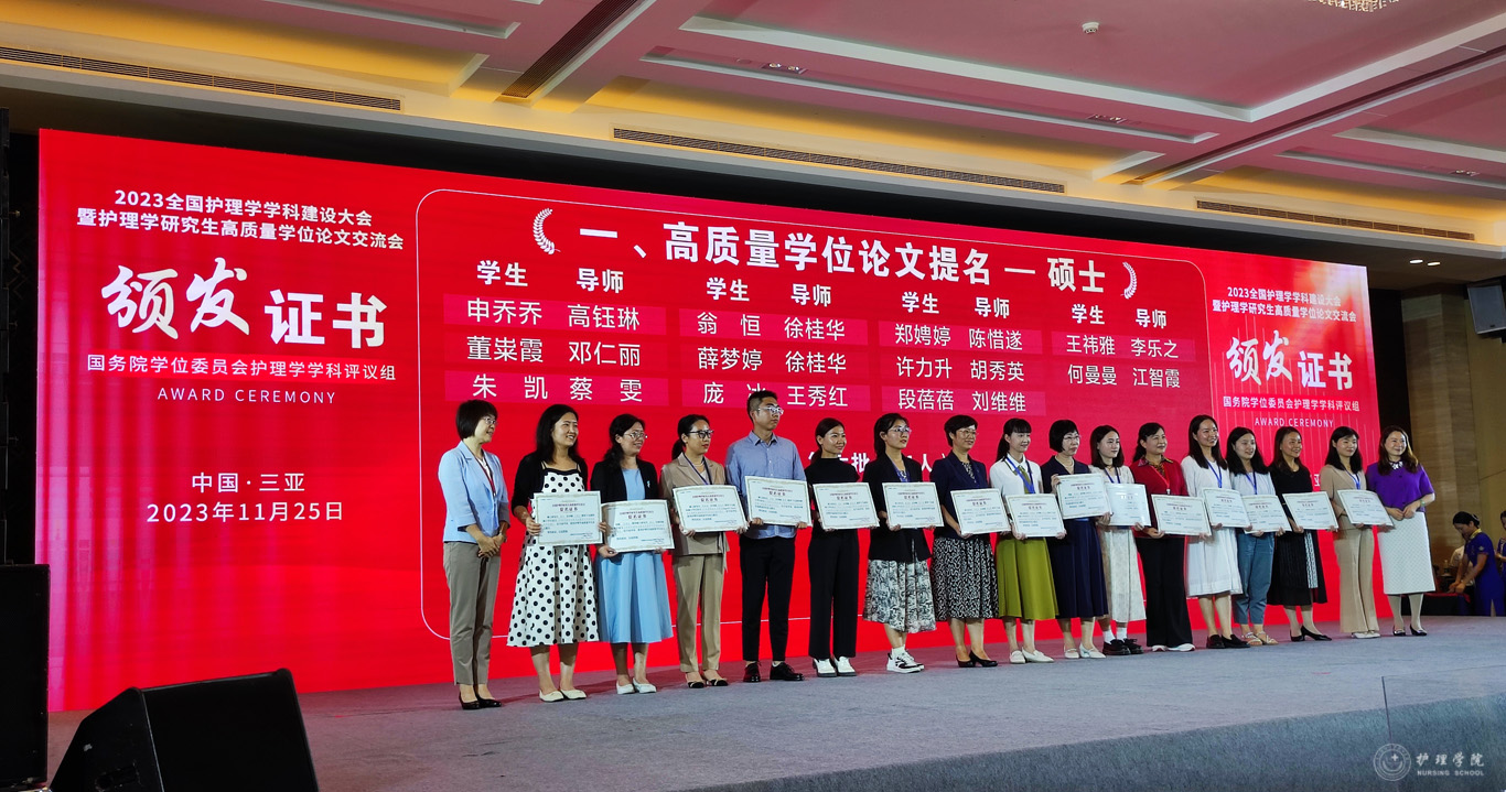 会议公布了前期由教育部护理学学科评议组开展的“高质量学位论文评选工作”情况及结果。来自全国70余所院校、2020届到2023届232篇博士硕士优秀论文进入评选目录。由研究生导师王秀红指导的美加墨世界杯官方网站2021届护理学学硕研究生王晶、2023届护理学学硕研究生庞冰的学位论文获评高质量学位论文提名奖。