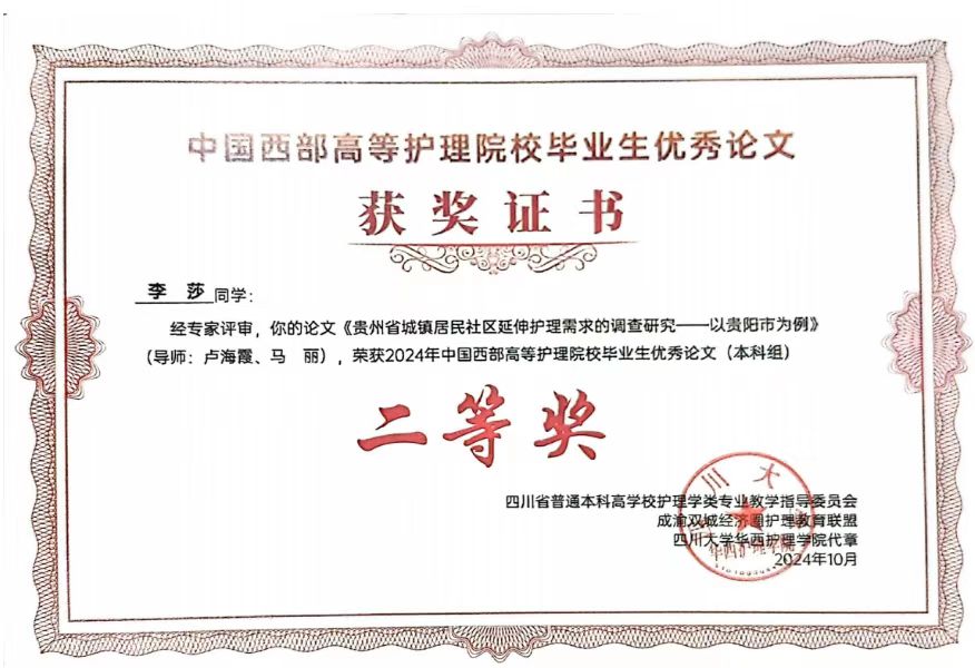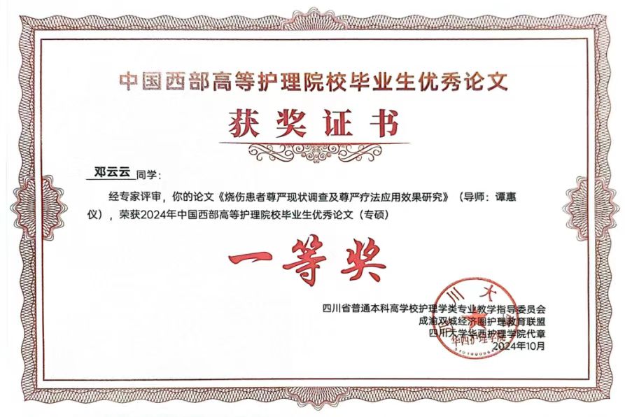 在此次优秀毕业论文评选中,2024届护理专硕毕业生邓云云,论文《烧伤患者尊严现状调查及尊严疗法应用效果研究》(导师谭恵仪主任护师)荣获专硕组一等奖;2024届科硕毕业生常慧,论文《社会资本对空巢老年人成功老龄化的影响:心理一致感与健康促进生活方式的中介作用》(导师王志稳教授、王秀红主任护师)荣获科硕组二等奖;2024届本科毕业生李莎,论文《贵州省城镇居民社区延伸护理需求的调查研究--以贵阳市为例》(指导老师卢海霞副教授、马丽副教授)荣获本科组二等奖。