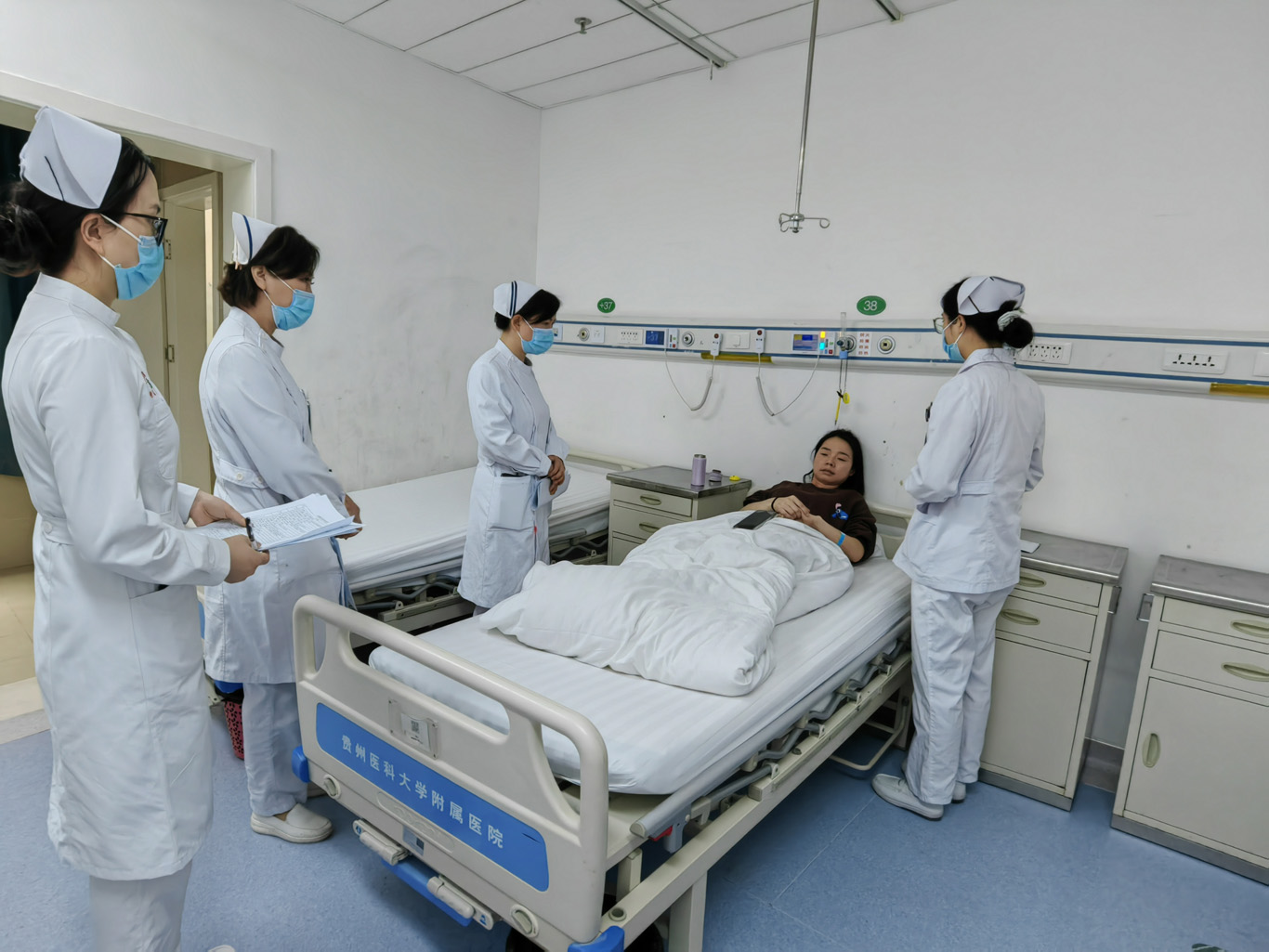 在前期筹备阶段,学院坚持医教协同理念,组建由临床与教学双线专家组成的考核工作小组,统筹部署并发布考核方案,全面落实各项准备工作。此次考核依托贵医附院各临床科室及临床技能中心有序展开,内容涵盖职业道德、护理文书书写质量、临床综合护理能力及专业外语等多维度能力评估,体现了临床实践与教育培养深度融合的导向。