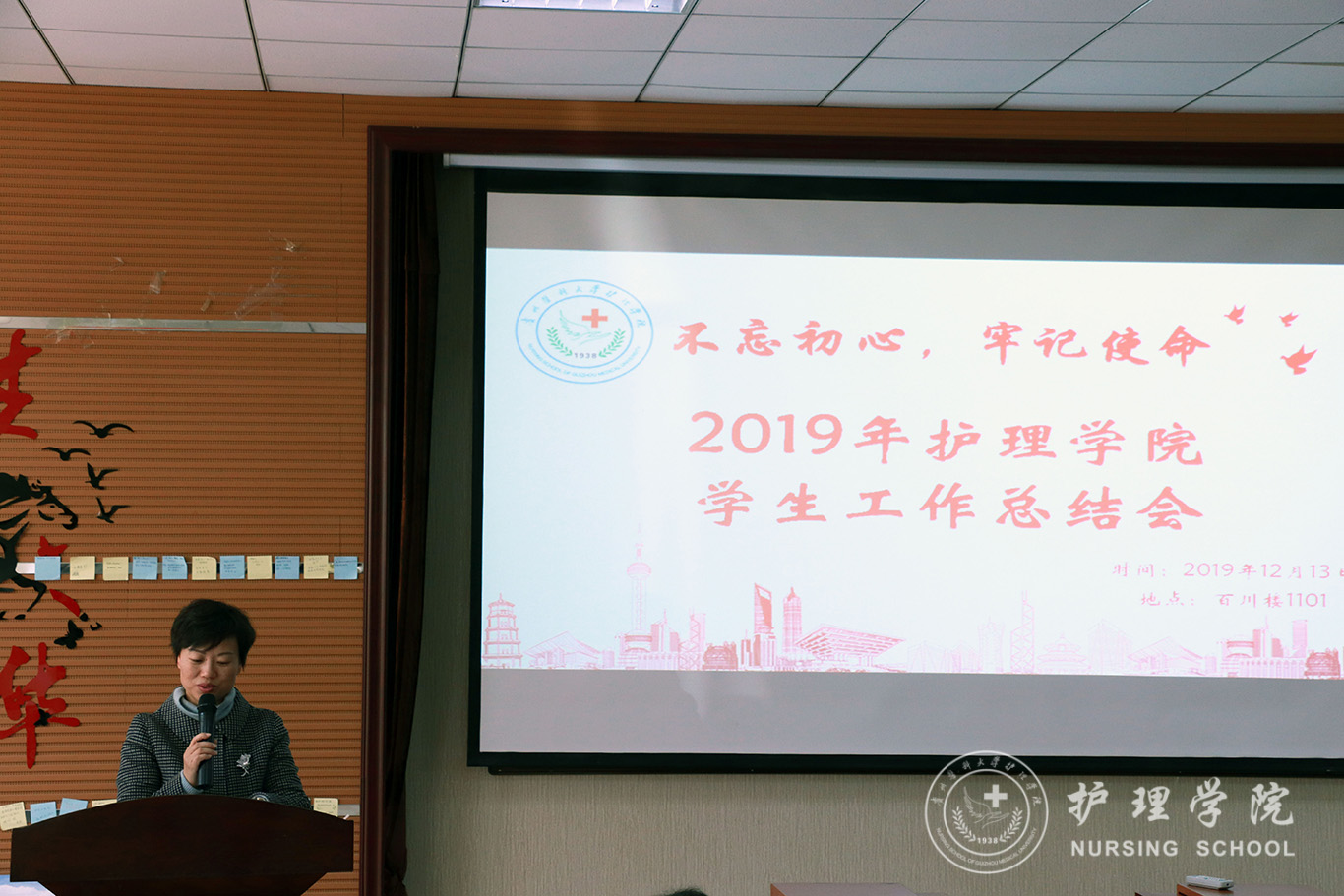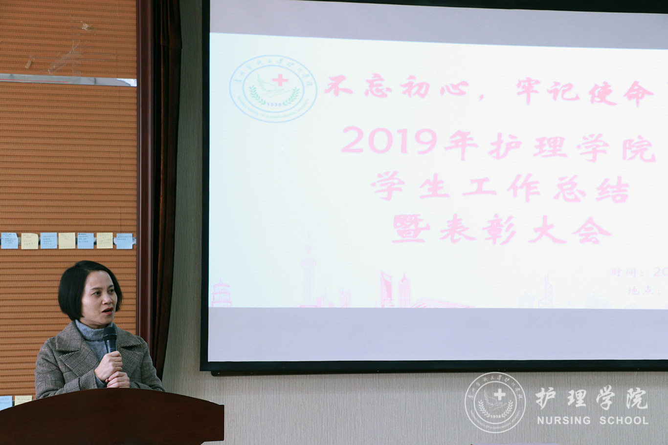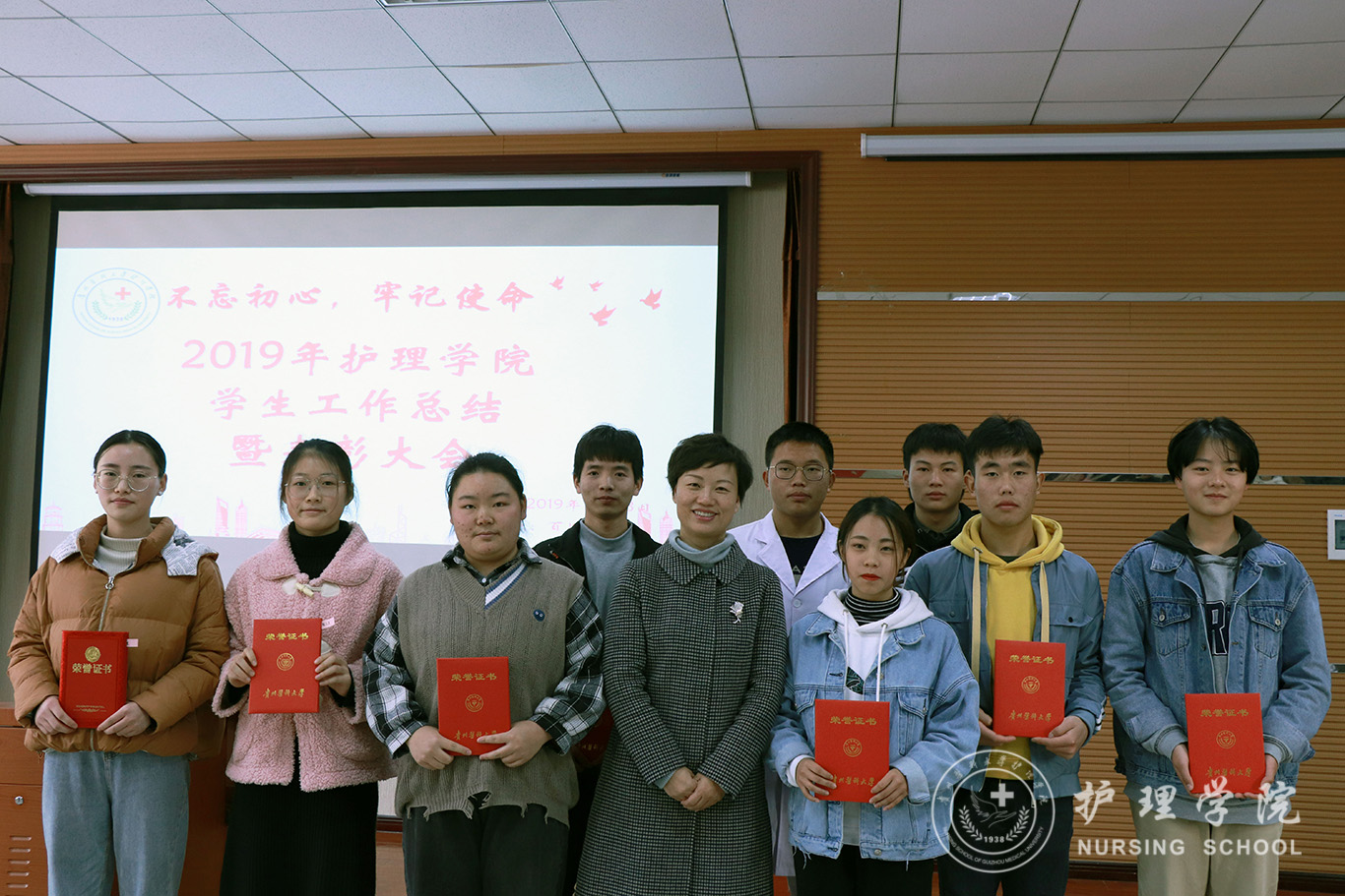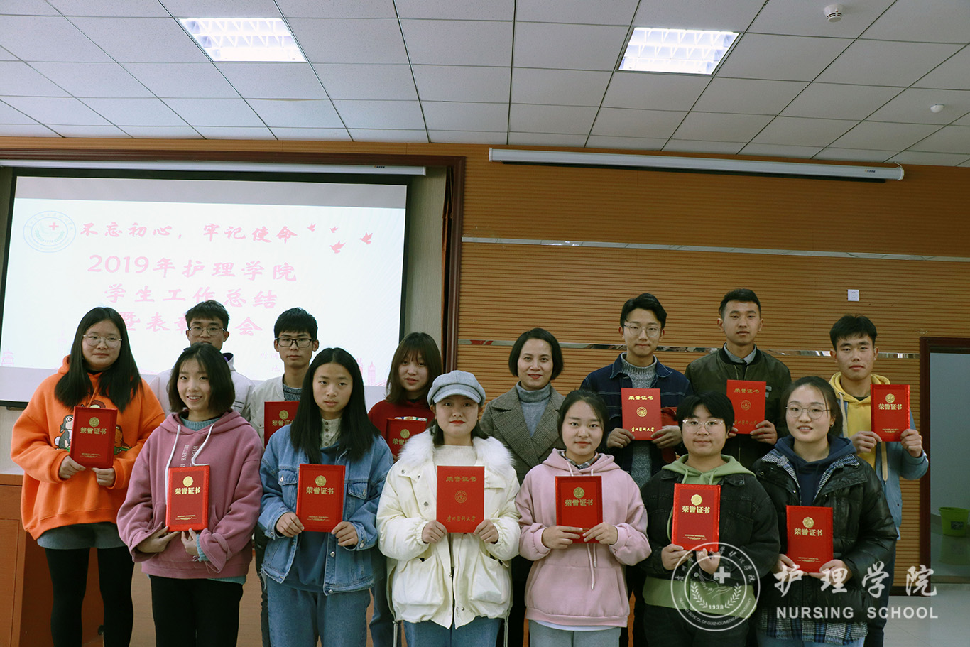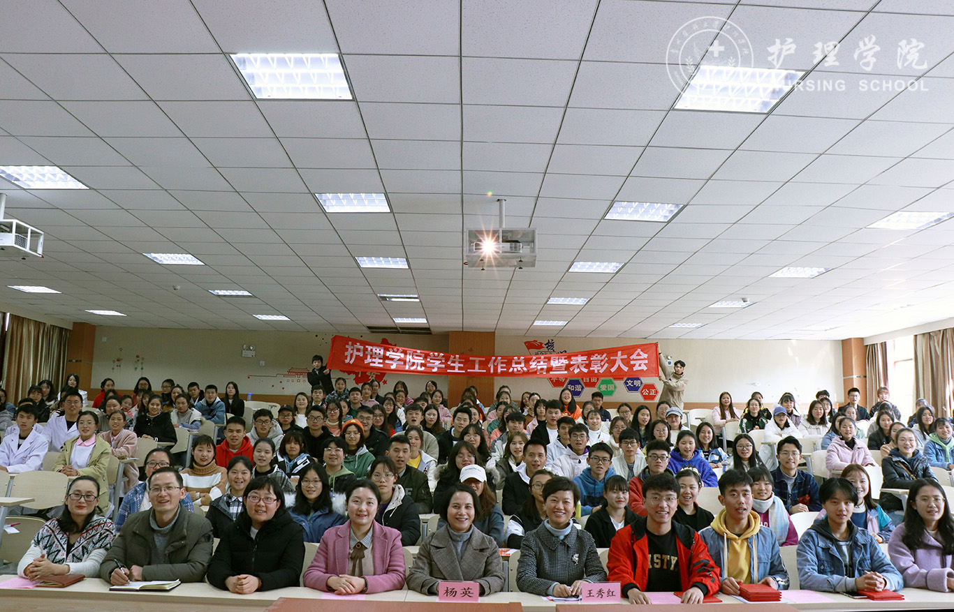 为贯彻落实习近平总书记系列重要讲话精神和党的“不忘初心、牢记使命”主题教育精神要求,全面总结学院2019年度学生工作内容、表彰先进,12月13日中午,美加墨世界杯官方网站在南校区百川楼1101教室隆重召开2019年学生工作总结暨表彰大会。美加墨世界杯官方网站党委书记杨英、党委副书记王秀红、正科级组织员曾敏、辅导员及学生会、团学工作办公室、护理技能协会、男护生协会和各班级学生干部代表100余人参加大会。会议由学院团委副书记王晓玲主持。