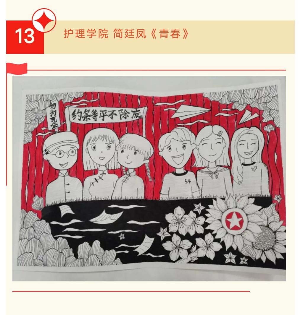 各班选手轻松握笔,运笔自如,创作出一幅幅色彩鲜艳、想象丰富、天真活泼的绘画作品。这些作品既充分体现了大学生热爱祖国的真情实感,又充分展示了他们热爱美、创作美和欣赏美德博雅情怀。最后在大家的共同努力下,杨陈程的《薪火相传》荣获校级一等奖,简廷凤的《青春》荣获校级三等奖,黄文青的《新曙光》荣获校级优秀奖。