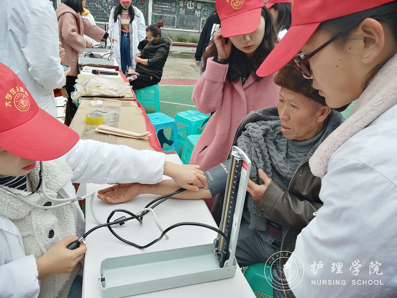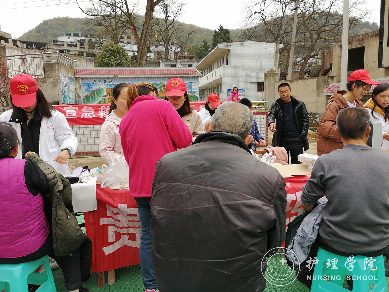 本次活动主要围绕急救知识的宣讲、止血包扎演示、测量血压及发放药品等内容展开。在急救知识宣讲和止血包扎演示过程中,村民们积极配合志愿者们进行活动操作的练习,主动要求扮演角色。志愿者为村民们讲述了发生意外受伤时如何自救或他救,提高了村民们对急救知识的认识。测量血压的摊前围满了村民,志愿者们耐心专注地为村民一一测量, 并在发放药品的同时为村民们宣讲了常见疾病的预防等相关健康知识。