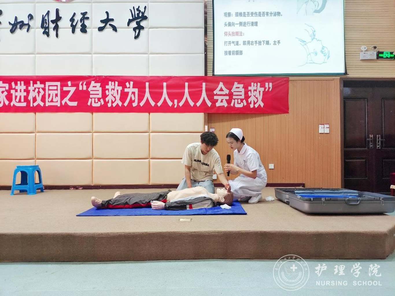 为普及应急救护知识,进一步增强大学生应对突发事件的互救和自救能力,提升公众应急救护技能水平。6月2日,美加墨世界杯官方网站组织师生代表前往贵州财经大学工商管理学院开展了“人人会急救,急救为人人”急救知识培训活动。美加墨世界杯官方网站教职工党支部书记、护理人文教研室副主任张仁莉,学院团委副书记王晓玲,护理人文教研室教师田晶以及护理技能协会代表参与了本次培训。