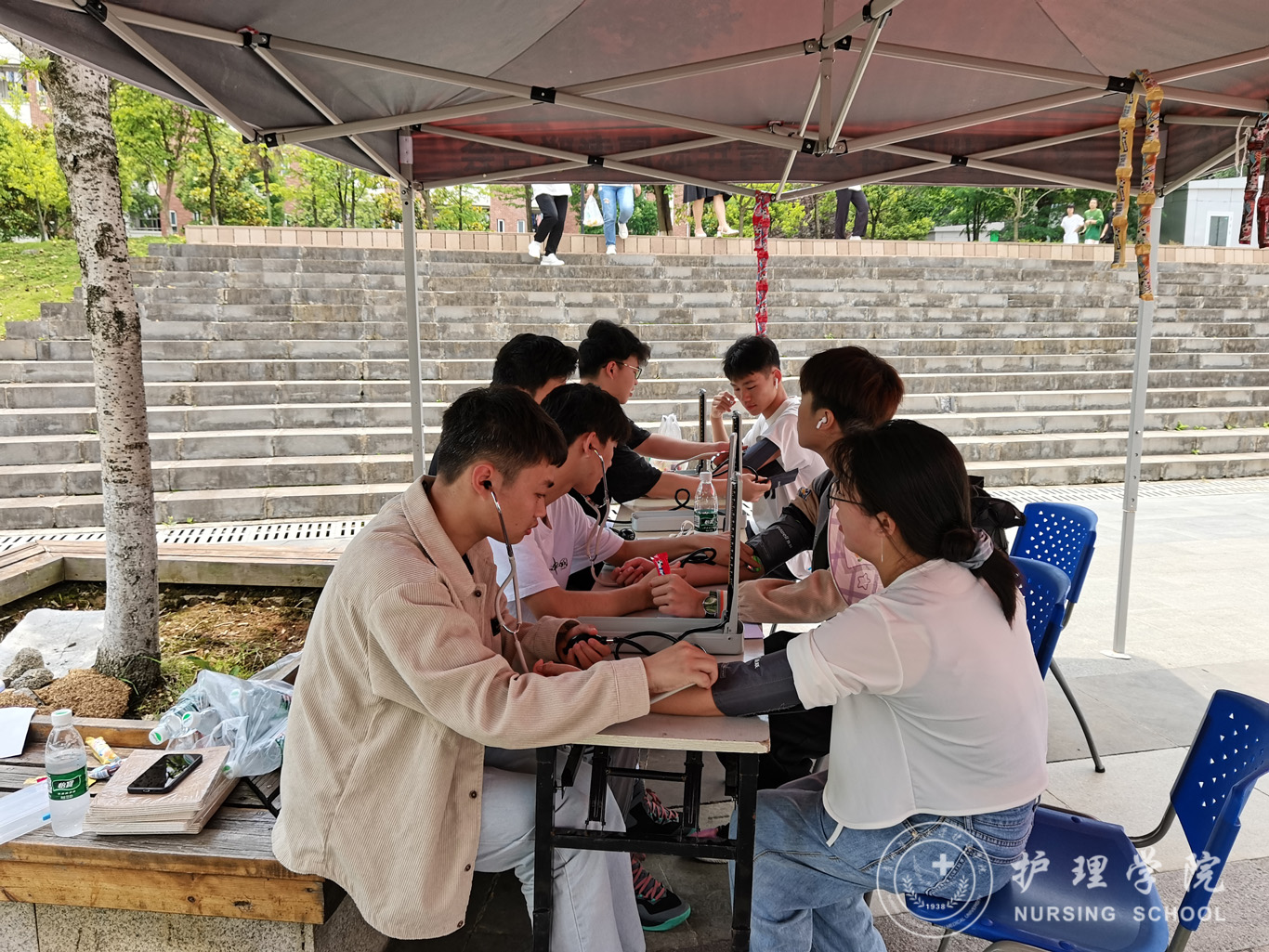 活动以健康宣教、现场演练、知识问答等多种方式进行。活动过程中,男护生协会成员为参与活动的同学测量血压并进行健康宣教。同时由护理技能协会成员为同学们集中展示了心肺复苏法(CPR),通过现场演练生动形象地介绍心脏骤停的原因及倒地患者是否需要实施急救的快速判断方法,详细地演示了成人实施心肺复苏技术的流程、方法及注意事项等。最后还组织进行了急救知识答题,以知识问答的形式帮助参与同学熟悉急救知识、了解急救理论。