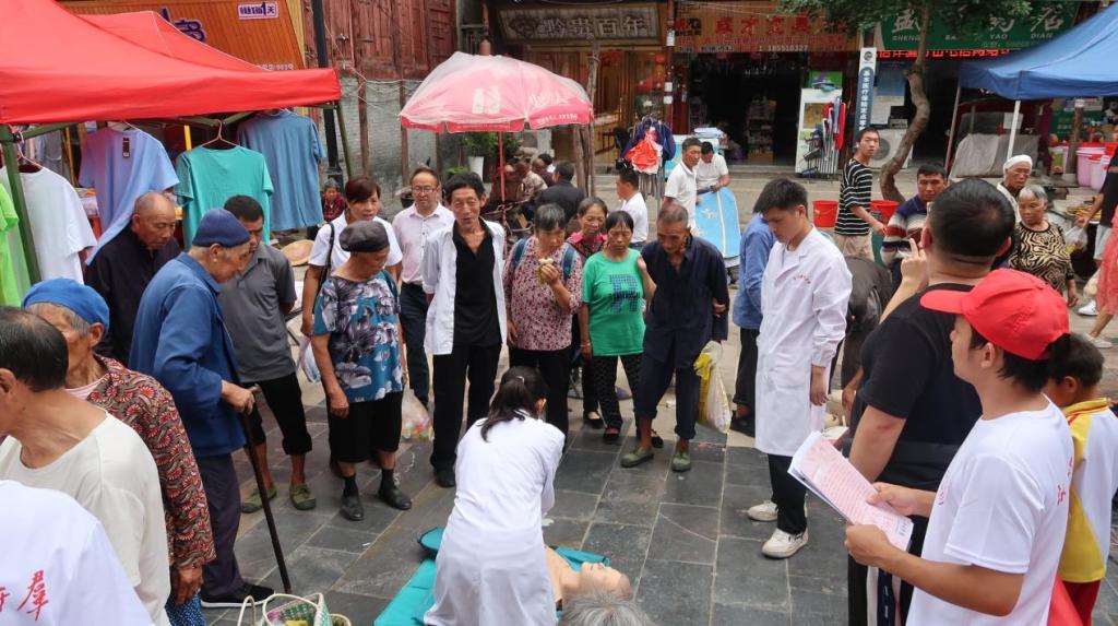 活动第二天,上午,志愿者们来到了猴场镇八一小学门口,为当地居民培训突发情况下的急救知识、普及常用健康知识、讲授常见疾病的预防与治疗,志愿者们还提醒居民们高温天气要注意防范中暑及防溺水,保障自身生命安全。之后志愿者们走上街头通过分发宣传单和现场讲解的方式为当地村民们进行禁毒防艾知识的宣讲与法律法规的宣传。细致热情接地气的宣传得到群众的大力支持和认可,在场群众纷纷表示很有收获,并将在以后的生产生活当中多加注意、积极学习。