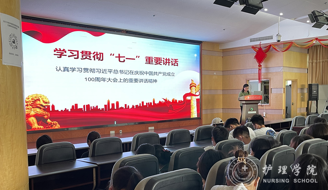 最后,李杏春围绕学习贯彻“七一”重要讲话精神,给同学上了一堂思想政治教育课。她指出伟大建党精神是中国共产党人精神谱系的红色基因,作为青年一代更作为新一代的医务工作者们,我们要传承好、继承好、发扬好伟大的建党精神。