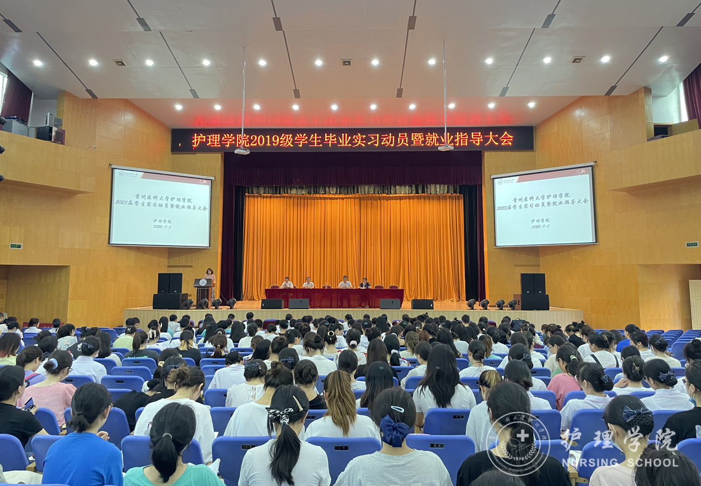 7月5日,为有效提高美加墨世界杯官方网站2023届学生实习工作的开展力度,促进实习工作的顺利进行,提高临床实践教学质量,美加墨世界杯官方网站在北校区大礼堂召开2023届学生实习动员暨就业指导大会。美加墨世界杯官方网站党委副书记兼纪委书记何为、副院长刘志燕、正科级组织员兼2019级助产学专业辅导员曾敏、2019级护理学专业辅导员杨叶卿及2019级全体同学参加。会议由生产实习科科长柳忠燕主持。