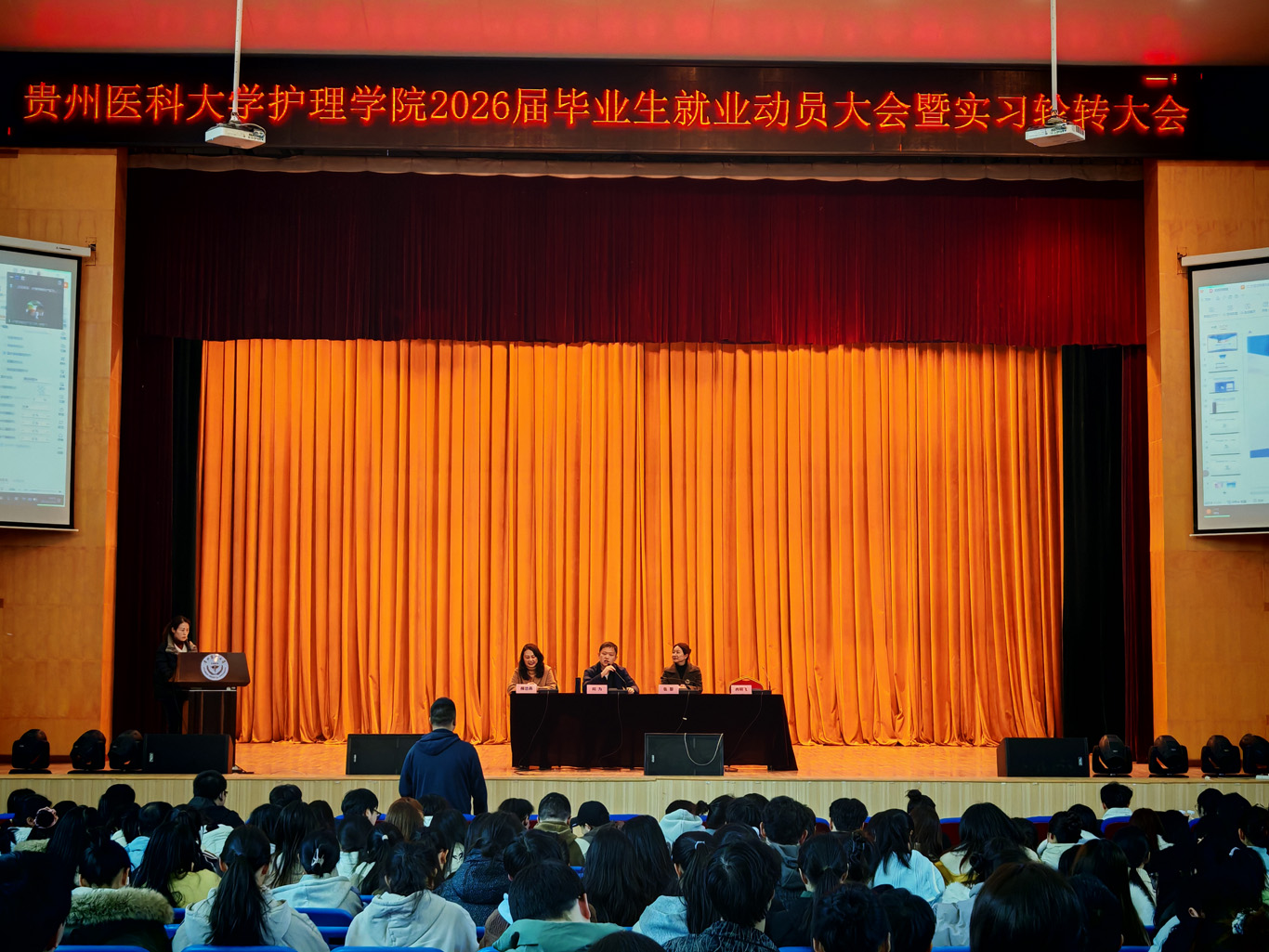 11月21日,美加墨世界杯官方网站在北京路校区大礼堂组织召开了2026届毕业生第二轮毕业实习轮转沟通会。美加墨世界杯官方网站党委副书记、纪委书记何为,副处级组织员张黎,生产实习科全体工作人员,2022级辅导员及全体2022级本科生通过线下线上参会。会议由生产实习科科长柳忠燕主持。