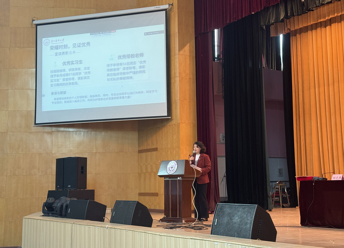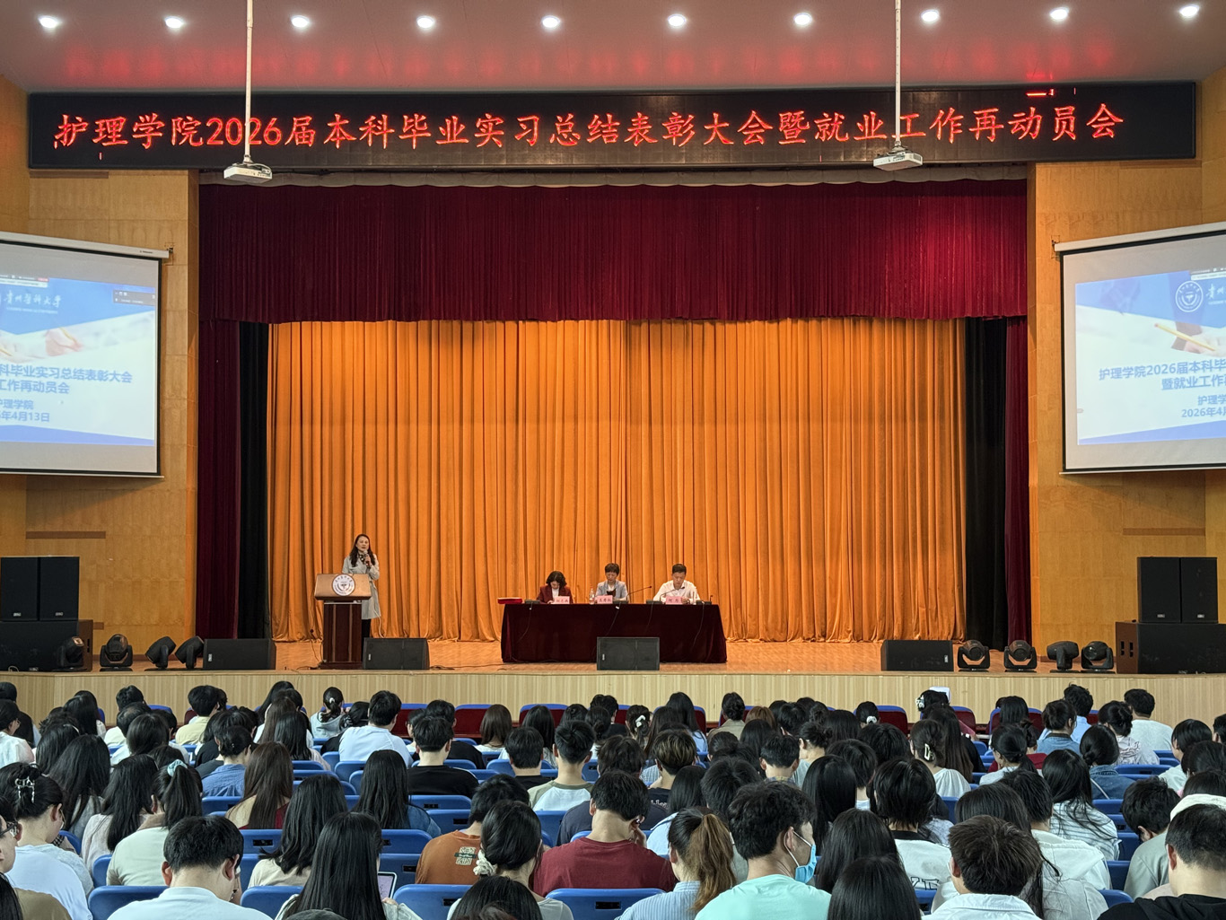 4月13日,美加墨世界杯官方网站在北京路校区礼堂召开了2026届本科生毕业实习总结表彰大会暨就业工作再动员会。美加墨世界杯官方网站院长王秀红、副书记何为、副院长刘志燕、生产实习科全体人员、2022级辅导员、附属医院优秀带教老师代表及2022级全体本科毕业生(专升本毕业生线上参会)参加此次会议。会议由美加墨世界杯官方网站生产实习科科长柳忠燕主持。