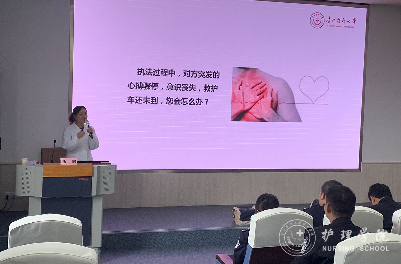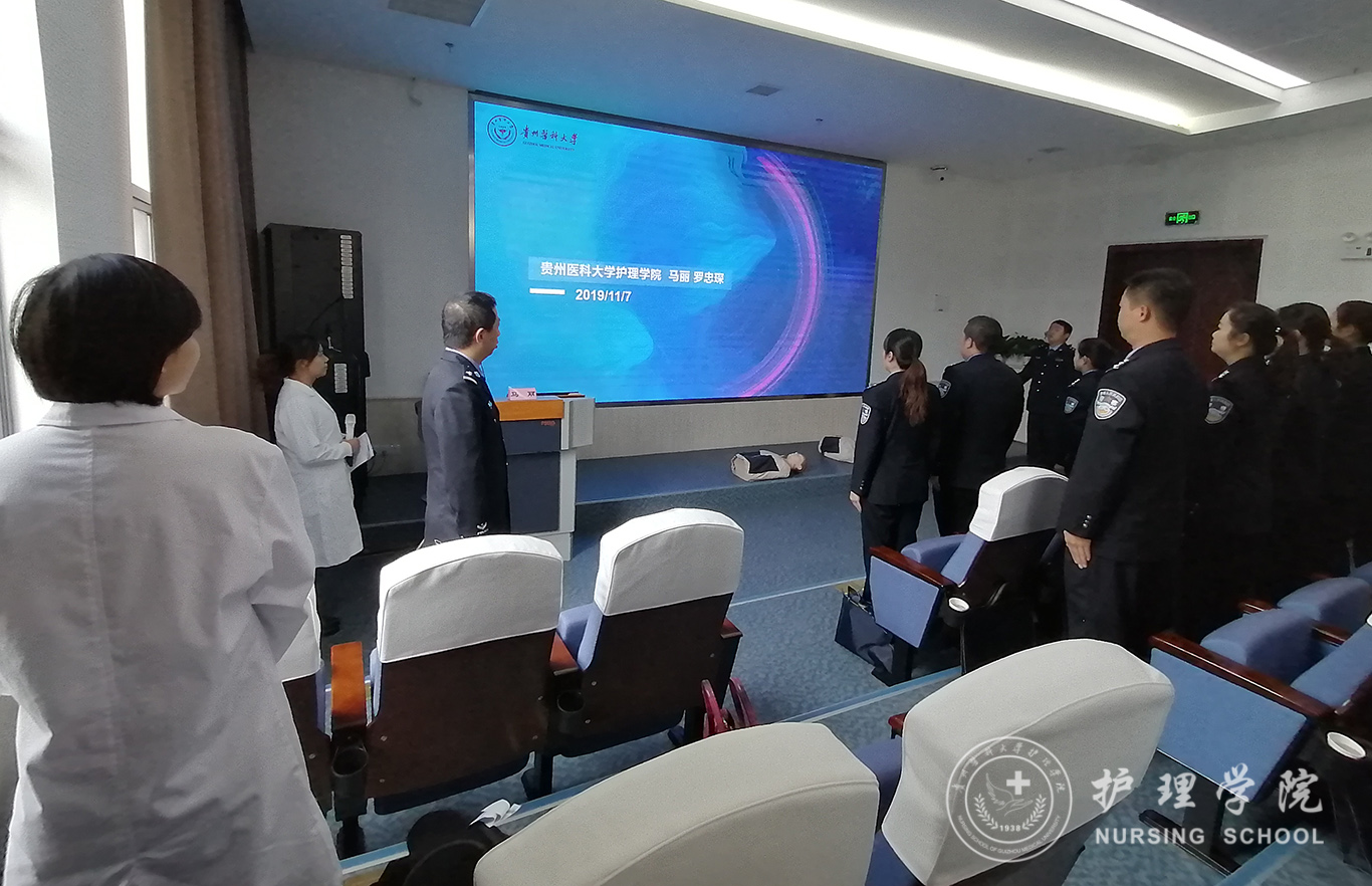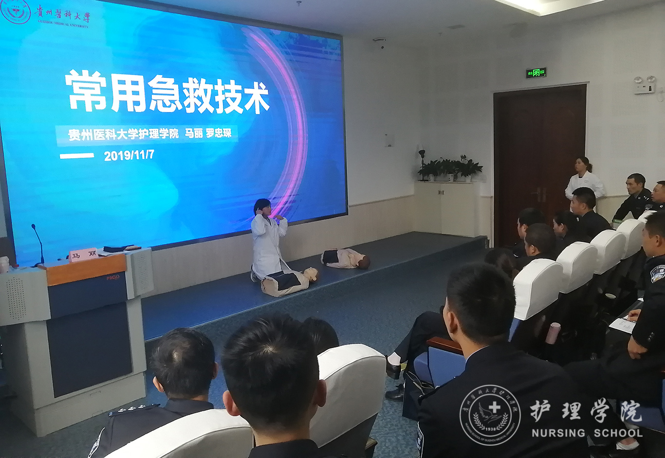 受贵州省人民检察院法警总队邀请,中国南丁格尔志愿护理服务队美加墨世界杯官方网站分队志愿者、美加墨世界杯官方网站外科护理学教研室教师马丽和罗忠琛于11月7日到观山湖区国家检察官学院贵州分院为“2019年贵州省检察机关新入警及晋升警衔司法警察培训班暨支队长硏讨班”授课,培训学员共55人,培训内容为常用急救技术。