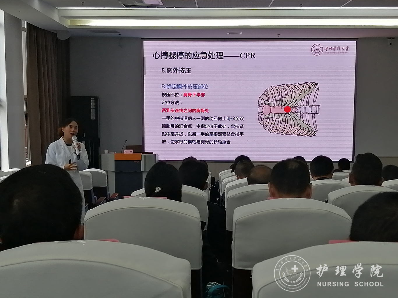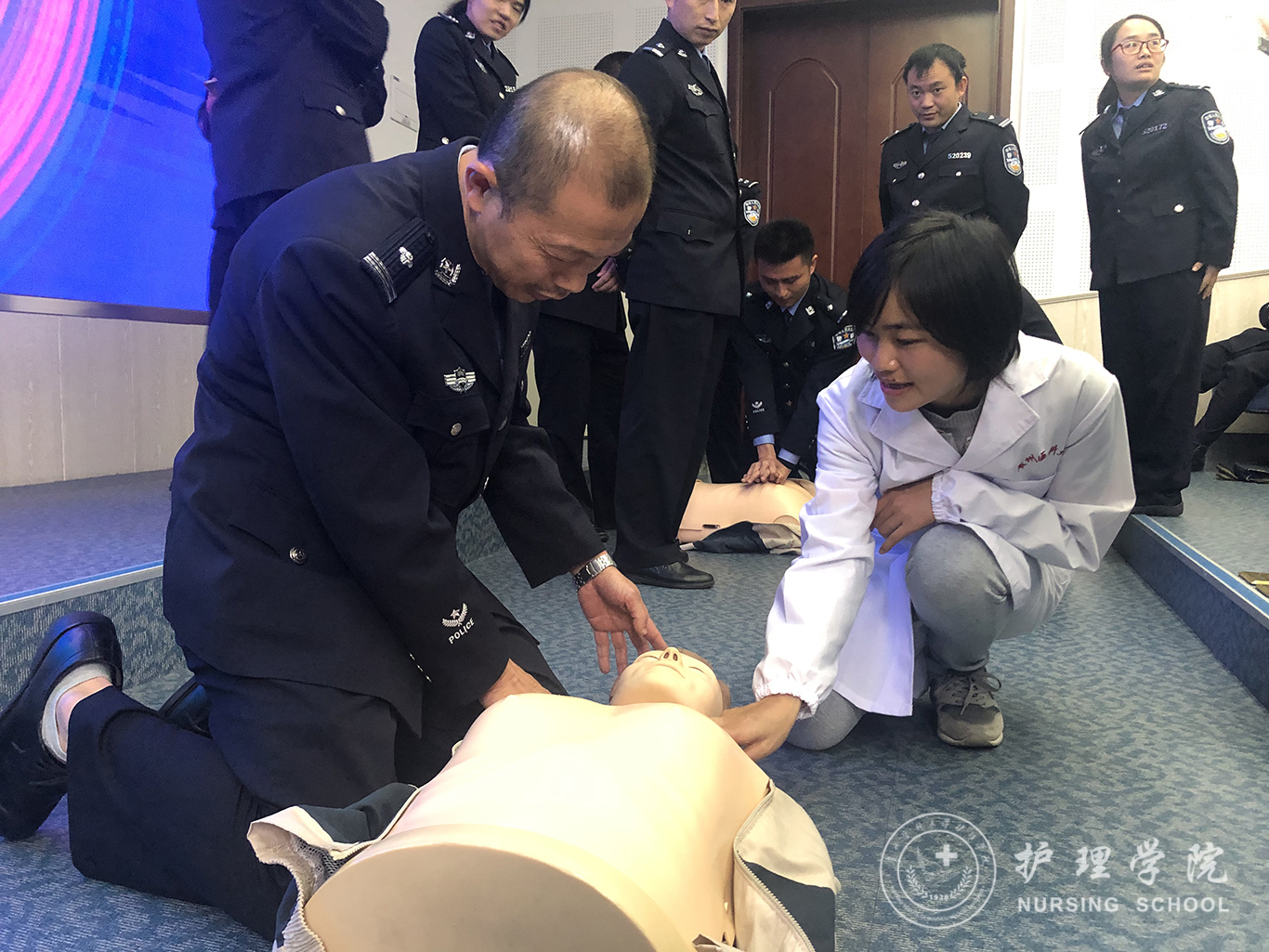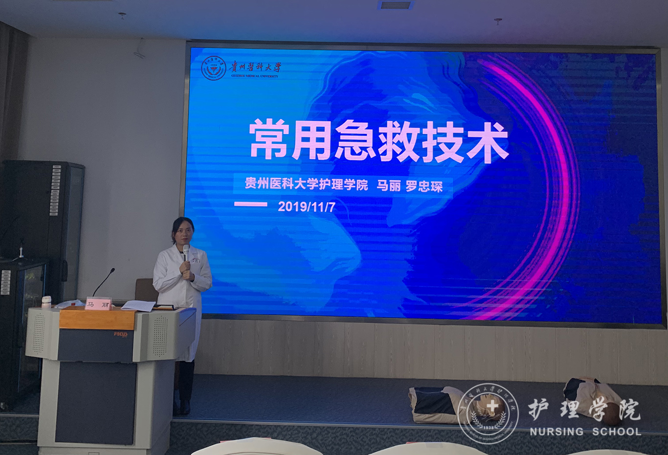 受贵州省人民检察院法警总队邀请,中国南丁格尔志愿护理服务队美加墨世界杯官方网站分队志愿者、美加墨世界杯官方网站外科护理学教研室教师马丽和罗忠琛于11月7日到观山湖区国家检察官学院贵州分院为“2019年贵州省检察机关新入警及晋升警衔司法警察培训班暨支队长硏讨班”授课,培训学员共55人,培训内容为常用急救技术。