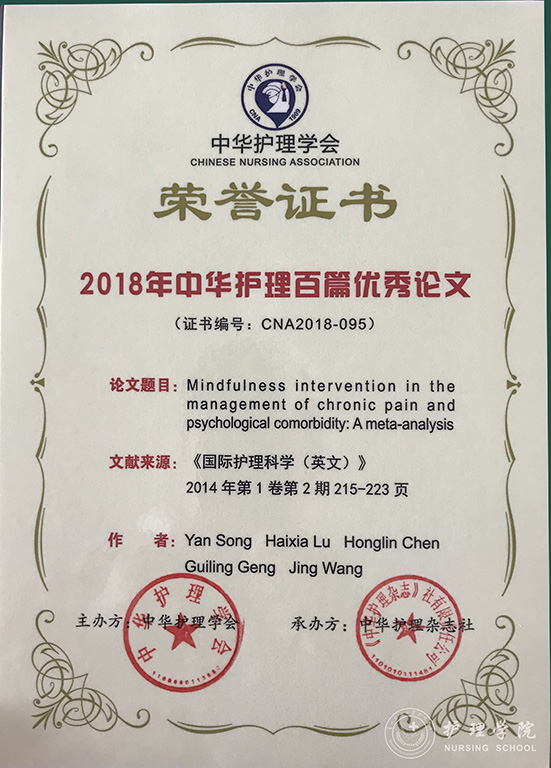 2018年11月24日,由中华护理学会、中华护理杂志社主办的以“合作·引领·创新”为主题的“2018年中国护理科研高峰论坛”在广州召开,世界杯官网卢海霞老师作为通讯作者2014 年发表在《国际护理科学(英文)》杂志的文章《Mindfulness intervention in the management of chronic pain and psychological comorbidity: A meta-analysis》被遴选为“2018年中华护理百篇优秀论文”。