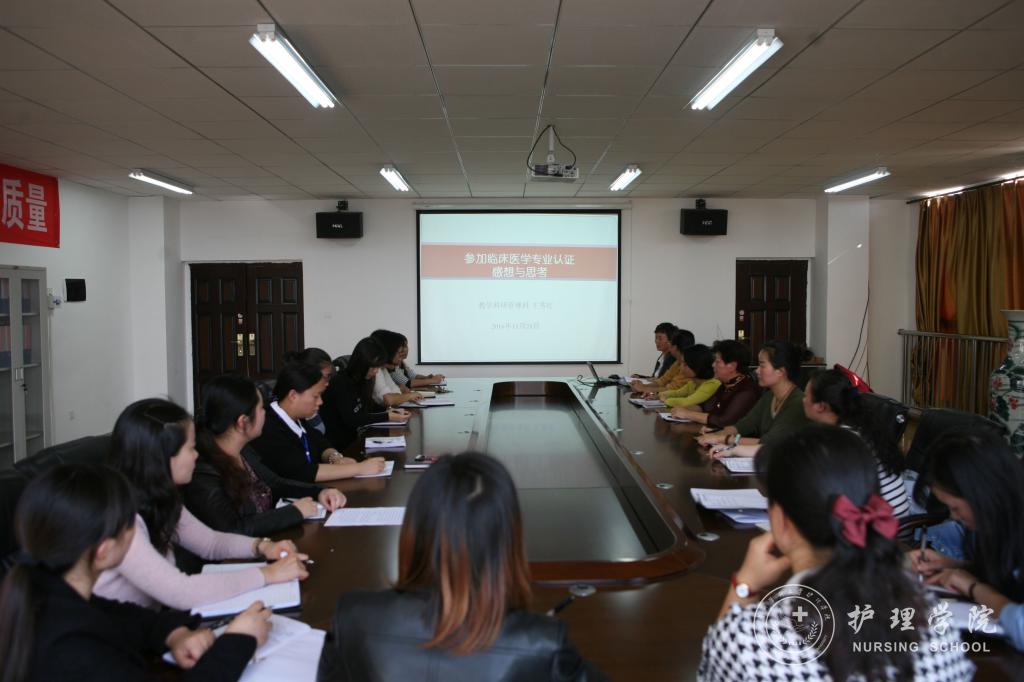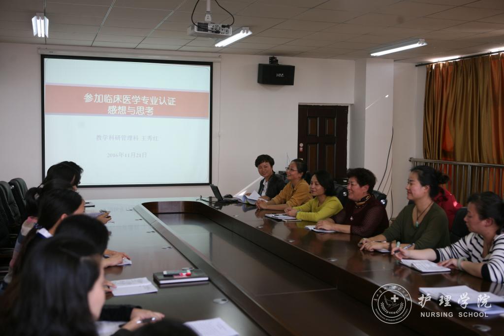 紧接着王秀红科长分享了她参加11月14日-17日我校临床医学专业认证工作的感想和思考。通过多天的跟随走访,了解到认证工作中专家的实地考察的内容和重点。观摩了校本部理论和实验教学课、附属医院的指导操作教学查房、病例讨论等教学活动。结合临床和护理专业认证标准,王秀红科长从宗旨与目标、教育计划、学生成绩评定等十个方面对跟随走访过程中的要素进行了全面分析,并结合即将进行的本科教学审核评估工作、护理专业认证工作提出美加墨世界杯官方网站的整改建议和努力方向,进一步明确和强化了教学实施过程及相关管理要求,为真正落实“以评促建、以评促改、以评促管、评建结合、重在建设”核心方针,突出内涵建设、强化内部质量保障体系建设树立牢固基础。
