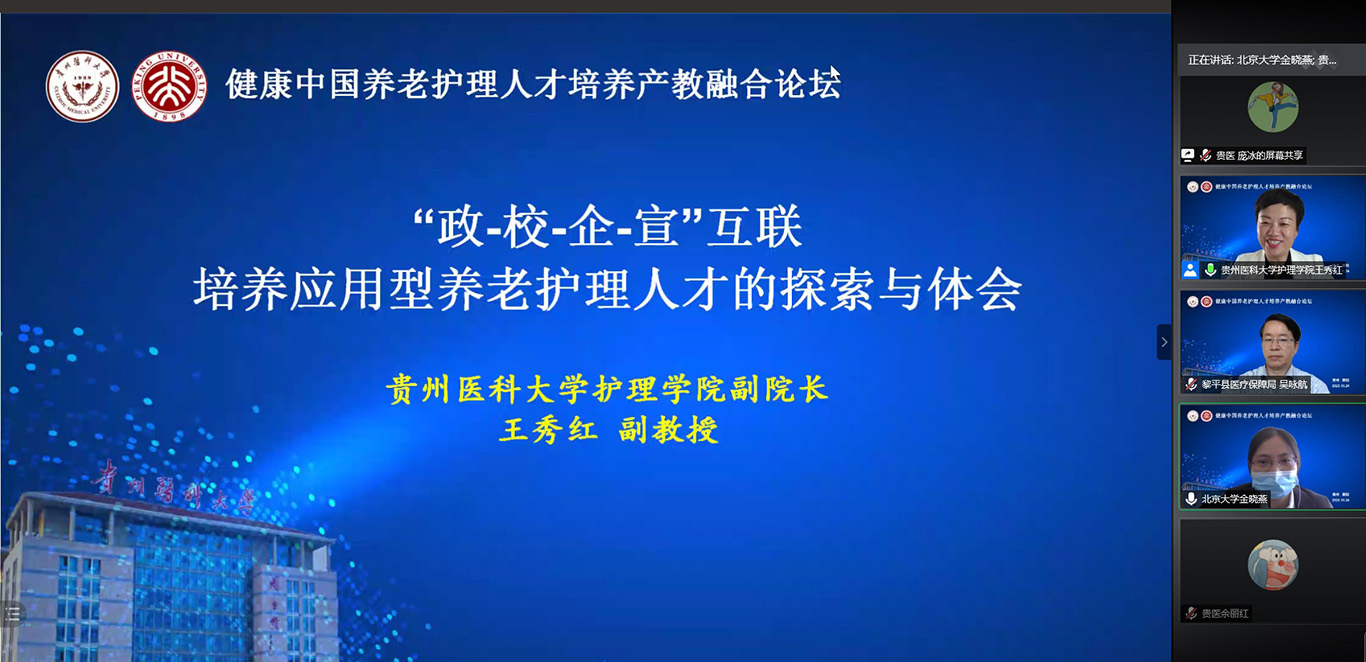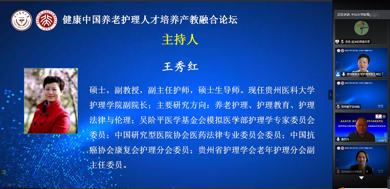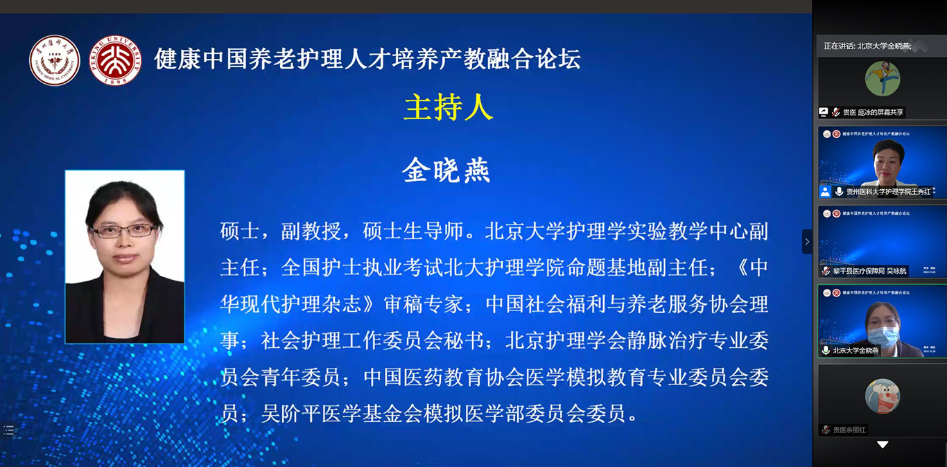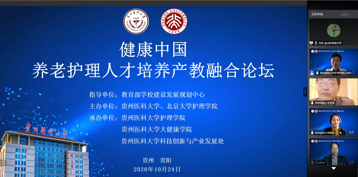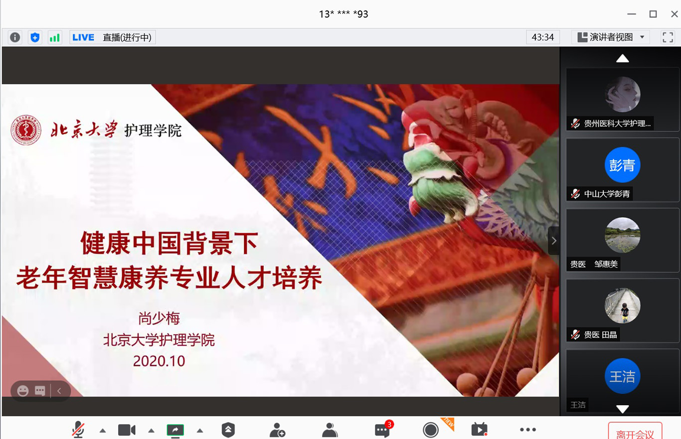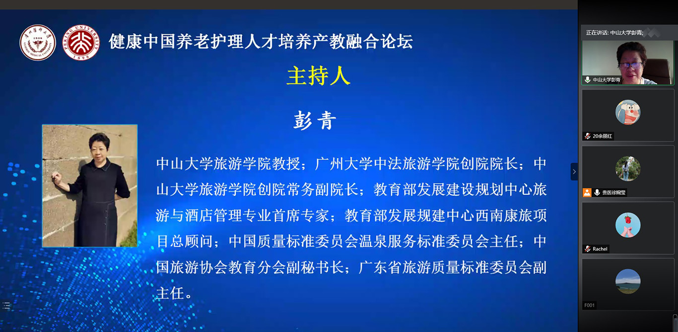 中国已经进入人口老龄化快速发展阶段,老年护理需求与老年护理人才供给严重失衡,如何才能更好培养符合社会需求的老年护理人才,满足养老市场需要?10月24日,2020年老年节前一天,美加墨世界杯官方网站联合北京大学美加墨世界杯官方网站在线举办了《健康中国养老护理人才培养产教融合论坛》,全国各地近400名护理、养老、康旅等方面从业者通过会议及同步直播参会。论坛由美加墨世界杯官方网站党委书记杨英、中山大学旅游学院教授彭青、北京大学美加墨世界杯官方网站副教授金晓燕、美加墨世界杯官方网站副院长王秀红分别主持。