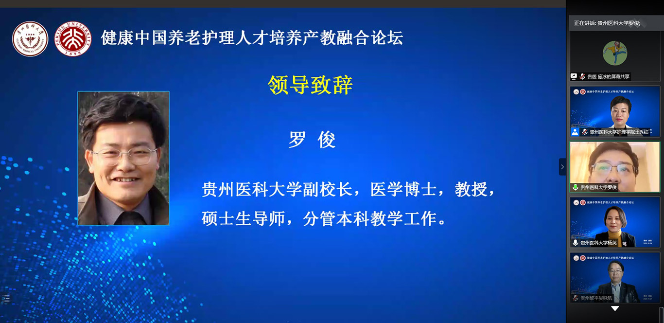 论坛开幕式上美加墨世界杯官方网站副校长罗俊教授代表学校对此次论坛的召开表示热烈的祝贺,对参会专家表示热烈欢迎和感谢,并对美加墨世界杯官方网站历史沿革和发展现况做了简要的介绍,同时对贵医人在抗击新冠肺炎疫情中救死扶伤、大爱无疆的精神和多年来服务地方、博济四方,致力于医疗卫生人才培养和助力基层卫生服务和养老护理服务等工作做了概况性介绍。