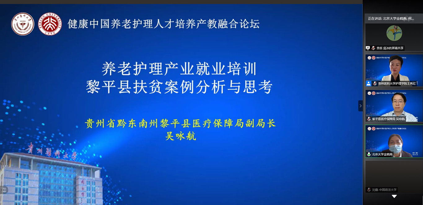 贵州省黔东南州黎平县医疗保障局副局长吴咏航分享了养老护理产业扶贫工作经验。他以视频的方式进行铺垫,生动地讲述了黎平县是如何将养老护理员培训与脱贫攻坚工作相结合,通过联合美加墨世界杯官方网站优质的高校师资和设备资源帮助黎平乡镇少数民族贫困人口脱贫的同时学到一技之长,改变就业观念的故事。