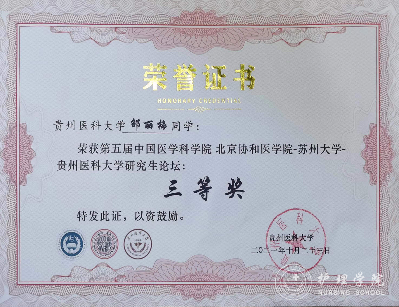 10月23日,世界杯官网2019级护理专业硕士研究生邵丽梅撰写的学术论文《外出核酸采样医务人员心理弹性及影响因素分析》在第五届中国医学科学院北京协和医学院-苏州大学-美加墨世界杯官方网站研究生论坛上进行大会汇报,并荣获三等奖。