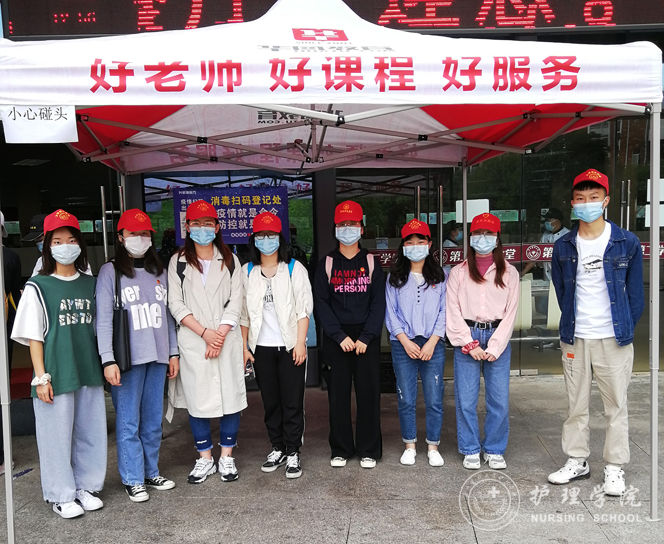 5月24日,2018级护理学乙班团支部副书记赵欢带领入党积极分子在南校区七栋宿舍楼下设点,开展帮助到校同学办理报到登记、搬运行李等志愿服务活动。志愿者们井然有序地指导抵达宿舍楼下的同学依次进行消毒、测量体温、登记信息并帮助返校同学搬运行李到寝室。