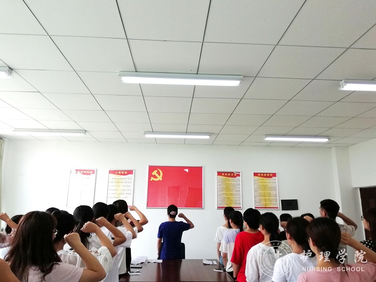 6月29日中午,美加墨世界杯官方网站在南校区美加墨世界杯官方网站党员活动室举行新党员入党宣誓仪式。学院党委副书记杨英、学生党支部书记李颖、全体预备党员参加了活动。宣誓仪式由学生党支部书记李颖主持。