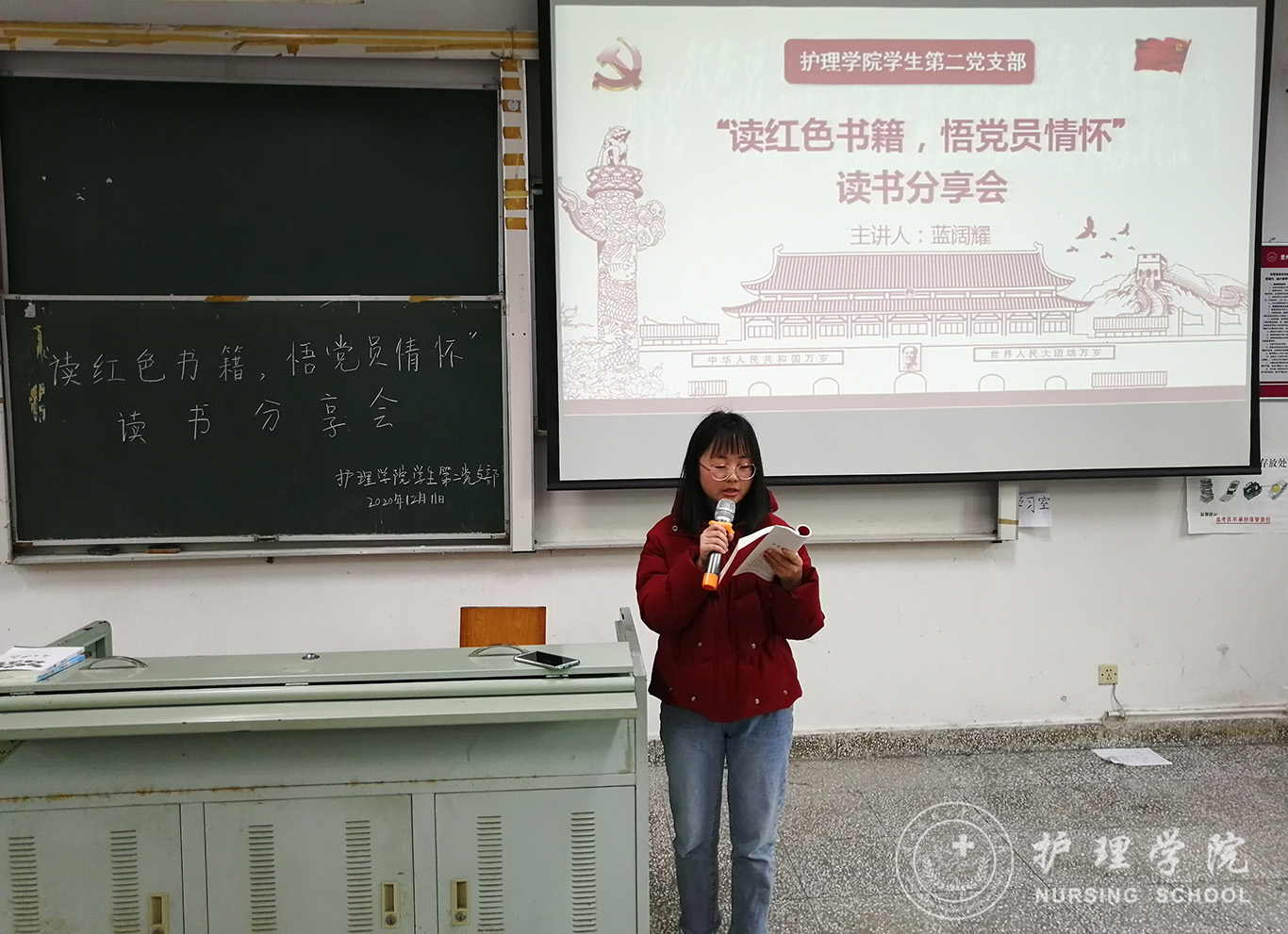 12月11日,美加墨世界杯官方网站学生第二党支部为全力推进学生第二党支部队伍文化建设,提高党员文化修养,营造崇尚学习的浓厚氛围,组织党员同学开展“读红色书籍、悟党员情怀”主题党日活动,本次活动由学生预备党员蓝阔耀主持。
