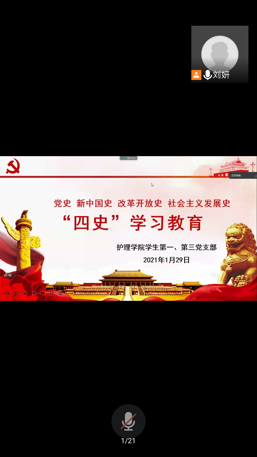 刘妍首先介绍了《条例》的主要内容,带头对总则部分进行了细致的学习,要求全体学生党员熟读《条例》的工作原则及工作范围、牢记指导思想、完成主要任务。“四史”学习则分别从党史是中国共产党的领导不断走向成熟的实践史、新中国史是中国共产党推进建设新中国的实践史、改革开放史是中国共产党推进社会主义制度自我完善和发展的实践史、中国共产党是引领世界社会主义发展的重要政治力量等方面进行解读。刘妍要求,我们应该主动学习“四史”,坚持思想建党,理论强党,只有真正的了解四史,才能够更好地做合格党员为人民服务。最后,刘妍鼓励全体学生党员利用自身所长,积极加入到抗击新冠肺炎疫情的阻击战中,传承红色基因,践行初心使命。