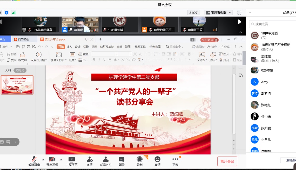 1月18日,美加墨世界杯官方网站学生第二党支部为丰富“不忘初心、牢记使命”主题教育学习形式,全力推进队伍文化建设,提高党员文化素养,营造崇尚学习的浓厚氛围,组织党员同学通过腾讯会议开展线上“一个共产党人的一辈子”主题党日活动,本次活动由学生第二党支部书记李杏春主持。
