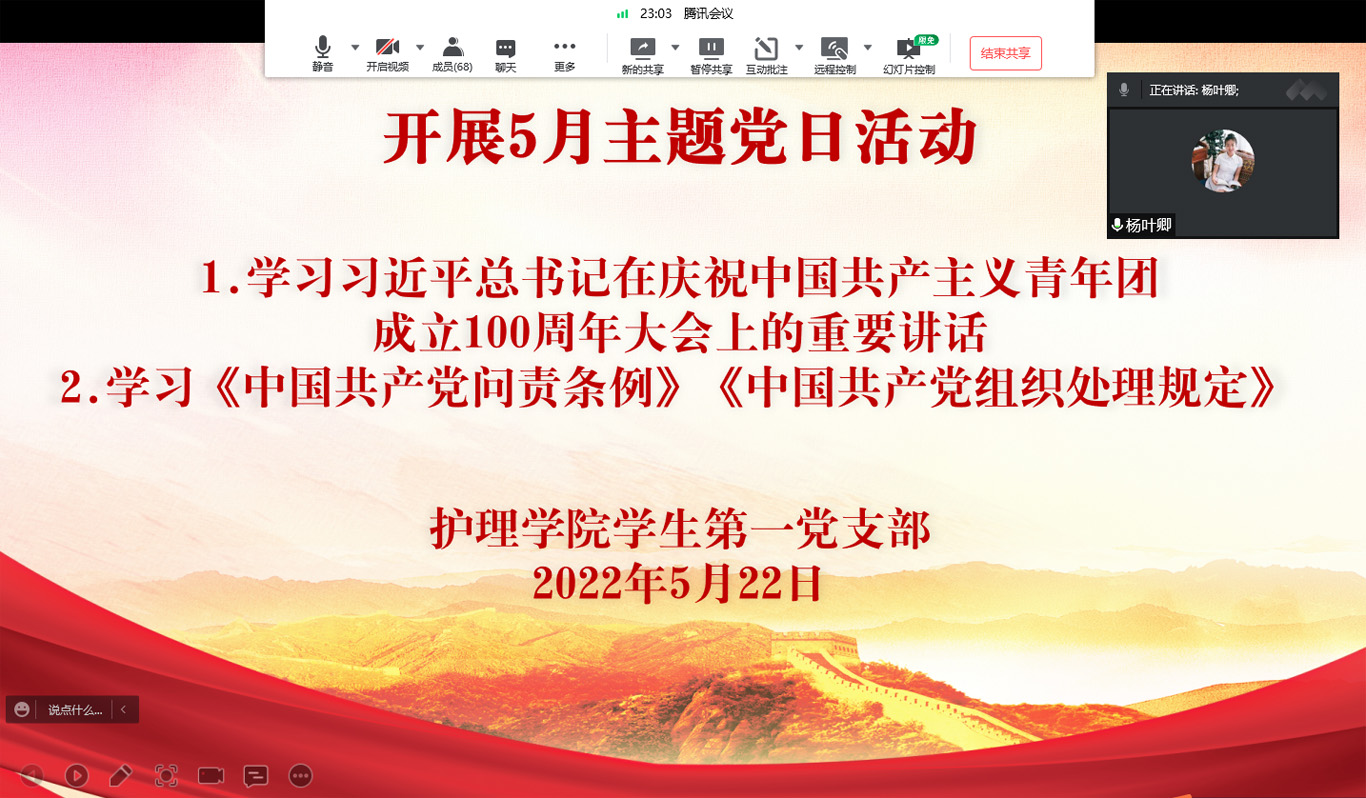 5月19至22日,为深入学习贯彻习近平总书记系列重要讲话精神,进一步弘扬党的光荣传统,更好地把青年团结起来、组织起来、动员起来,引导广大青年在思想洗礼、在实践锻造中不断增强自身的志气、骨气、底气。美加墨世界杯官方网站各学生党支部开展了习近平总书记在庆祝中国共产主义青年团成立100周年大会上的重要讲话精神、习近平总书记关于安全生产重要论述和指示批示精神、《中国共产党问责条例》《中国共产党组织处理规定》《中华人民共和国民法典》的理论学习。各学生党支部书记主持会议,全体党员通过线上形式参会。