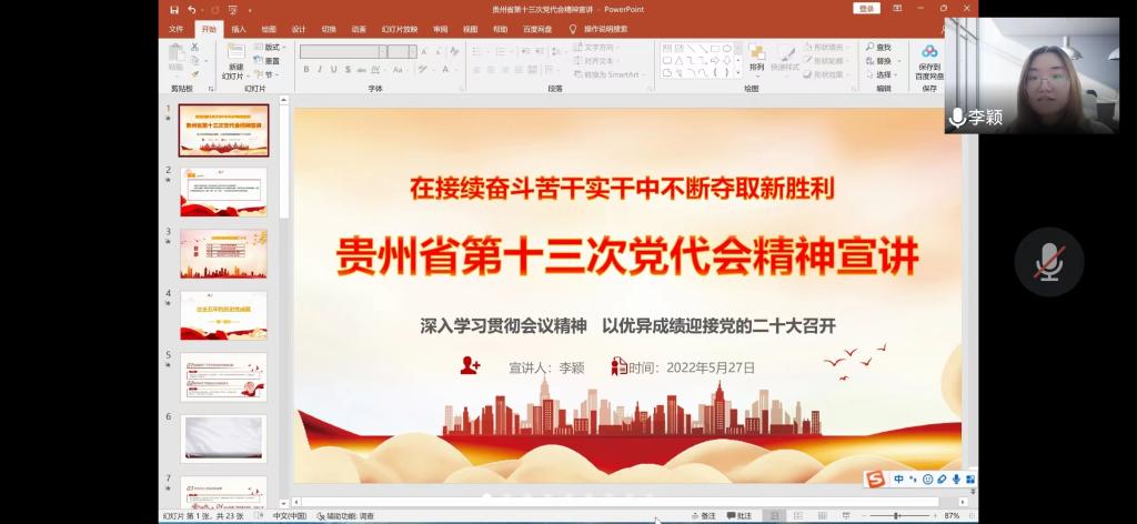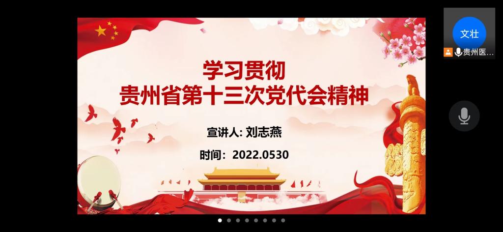 为深入学习贯彻省第十三次党代会精神,激励广大党员奋力谱写多彩贵州现代化建设新篇章,学院党委委员、副院长刘志燕,党委委员、综合办公室副主任李颖分别于5月27日和30日在美加墨世界杯官方网站学生第二党支部开展了省第十三次党代会精神宣讲活动。支部全体党员通过线上线下结合的形式参加宣讲,学院分党校第五十六期入党积极分子培训班学员列席宣讲。本次宣讲活动由支部书记刘文壮主持。