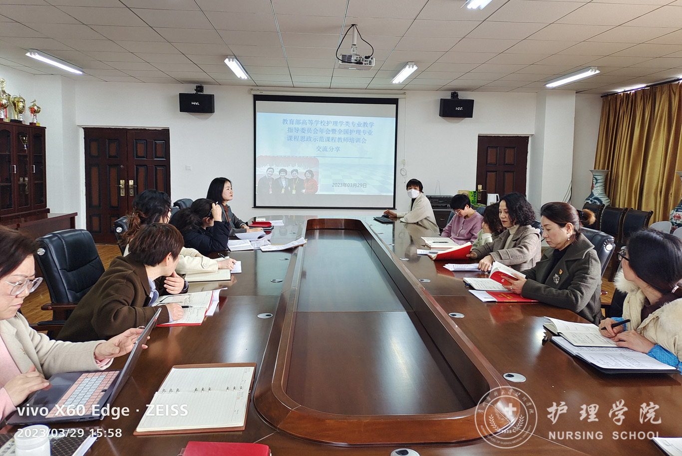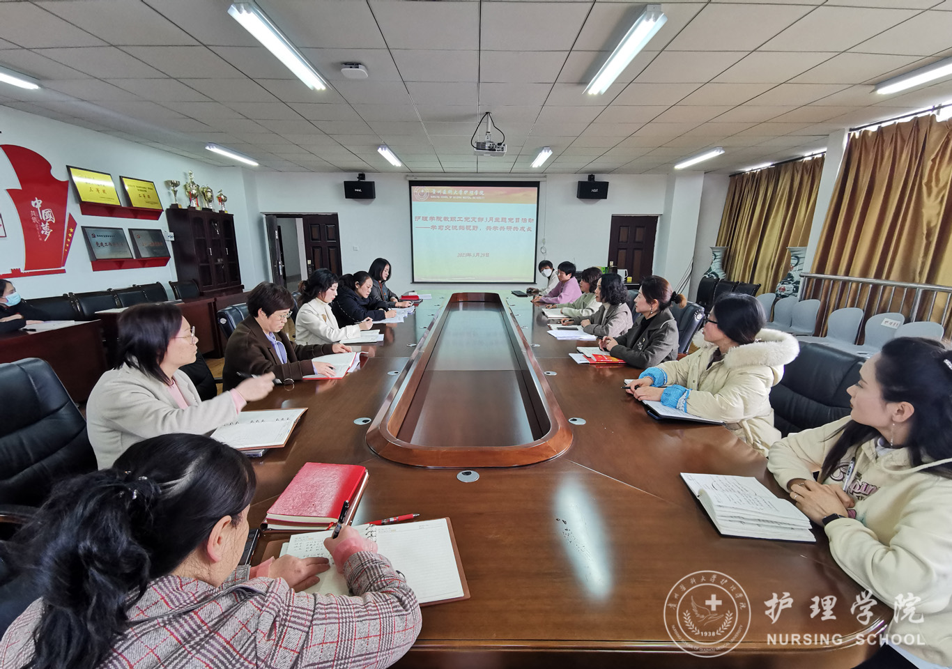 本次活动由刘志燕、晏家芳、刘林敏三位老师分享了赴南京参加“教育部高等学校护理学类专业教学指导委员会年会暨全国护理专业课程思政示范课程教师培训会”的感悟。三位老师从不同角度为大家介绍了培训会内容,并结合学院发展实际讲述了自己的所思所想、所感所悟。参会党员纷纷围绕思政课建设这一主题展开了讨论,并表示此次学习分享会收获颇丰、催人奋进。