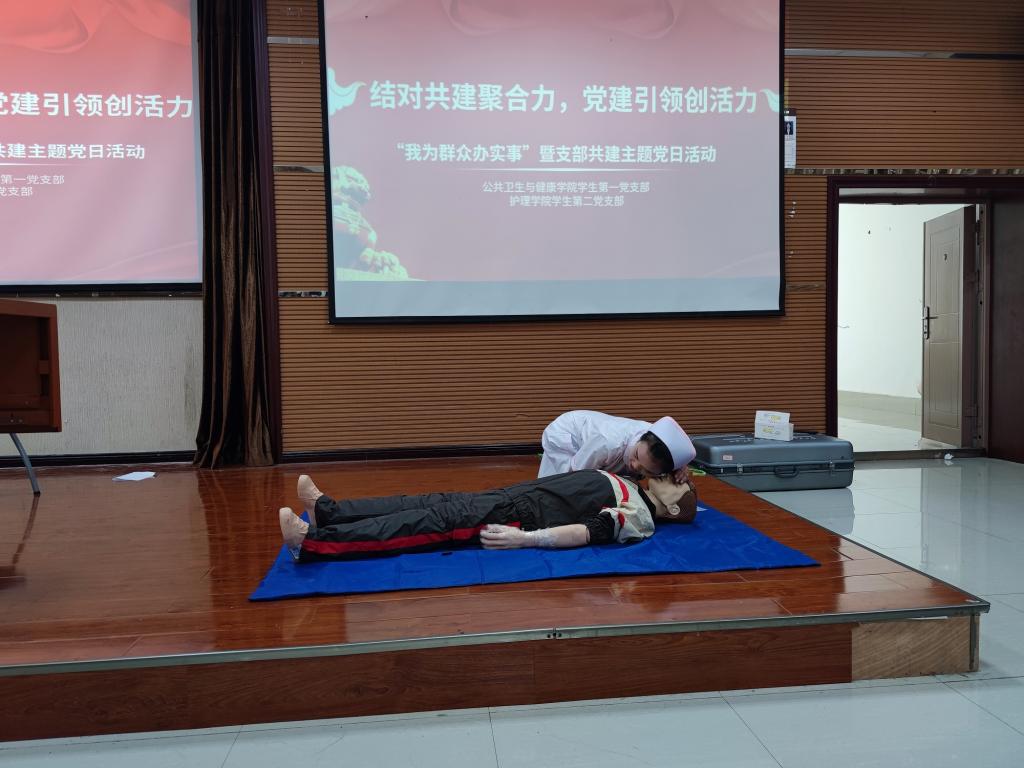 活动中,郝雪君以“努力成长为德智体美劳全面发展的社会主义建设者和接班人”为题,带领与会党员认真学习了《习近平著作选读》,为开展本次主题党日活动打下良好思想基础。随后,美加墨世界杯官方网站党员代表系统地为大家讲述并演示心肺复苏技术(CPR)相关的急救知识、成人实施心肺复苏技术的流程、方法及注意事项;公共卫生与健康学院党员代表讲解了结核病主要症状、传播途径、易感人群、防治知识等,帮助大家进一步了解疾病预防措施以及结核病治疗的有关政策。最后两个支部共同进行了红色诗词诵读及红色歌曲演唱,旨在传承红色精神、发扬红色文化,增进对党的忠诚与热爱。