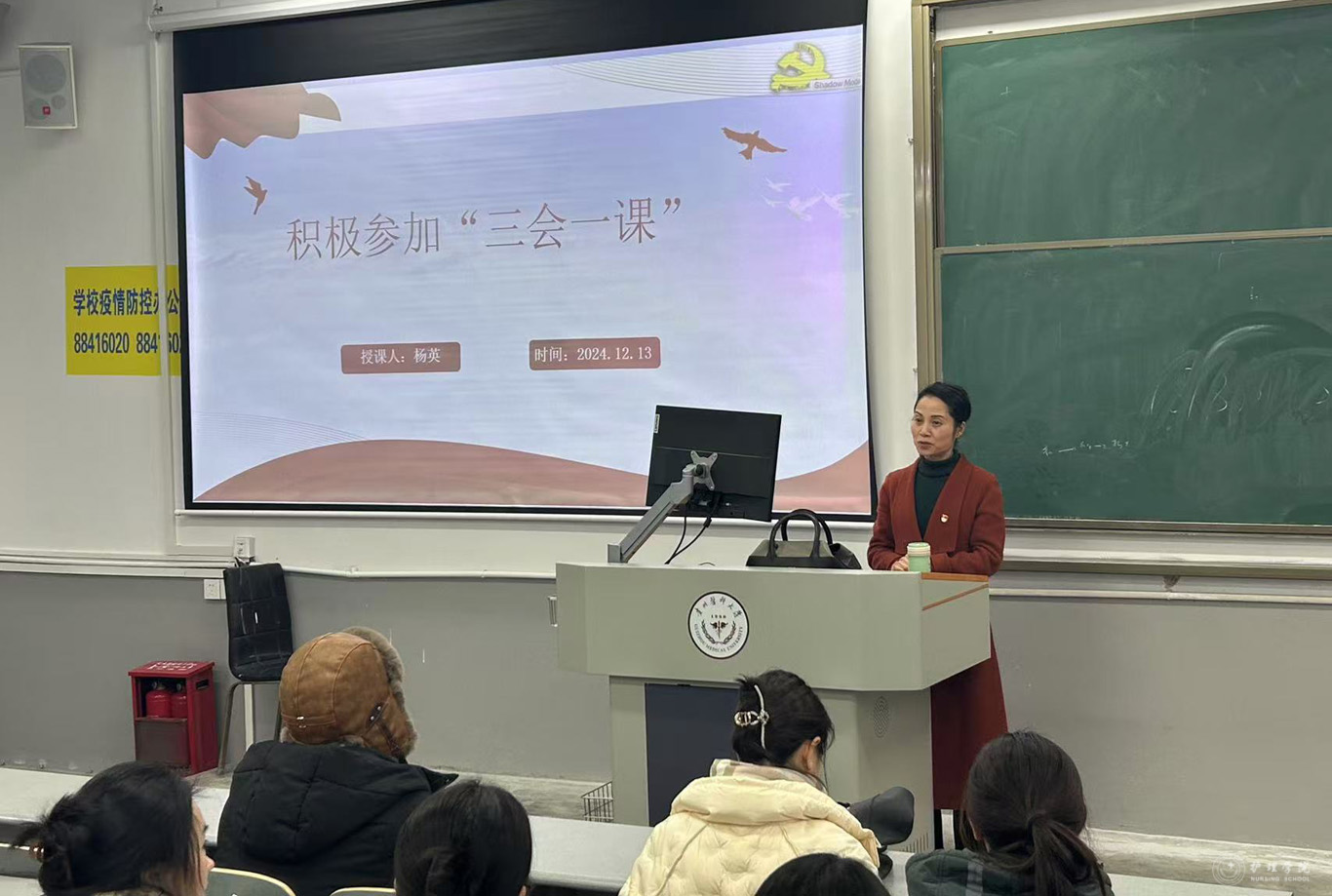 最后,杨英在总结中指出,作为新时代的学生党员,不仅要深刻理解“三会一课”的重要意义,更要在实际行动中积极践行。并提出了三点希望:一是要讲政治,衷心拥护“两个确立”、忠诚践行“两个维护”,不断增强“四个意识”、坚定“四个自信”;二是要讲学习,要深入学习贯彻习近平新时代中国特色社会主义思想,深刻领会党的二十届三中全会的精神内涵,扎实学习专业知识,发挥党员先锋模范作用;三是要讲情怀,要有家国情怀,始终听党话、跟党走,积极投身于强国建设的伟大实践中,始终牢记以人民为中心的发展思想,将人民的健康需求和利益放在首位。