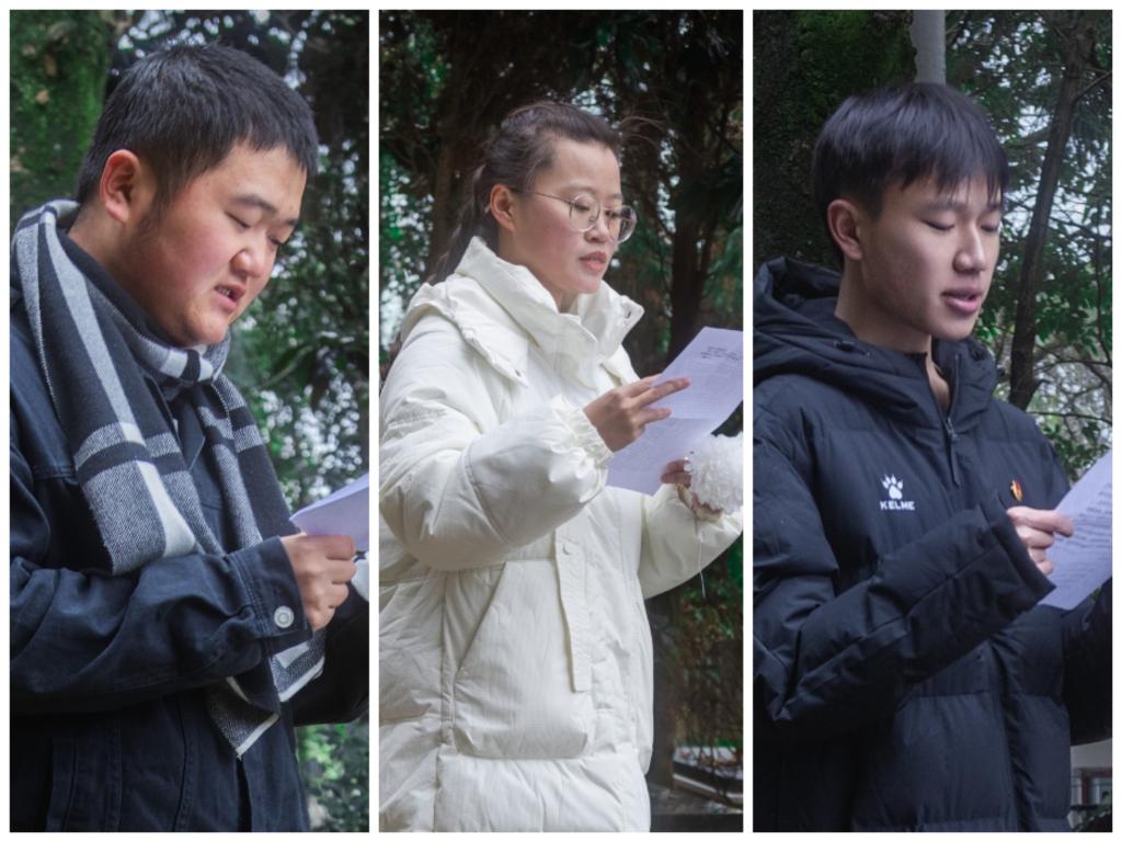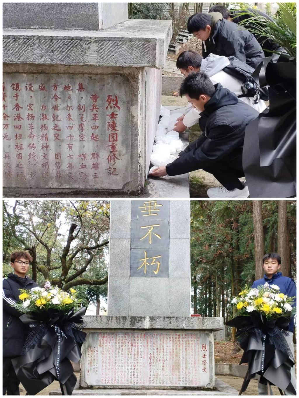 首先,刘文壮组织在场人员进行集体默哀,共同缅怀南京大屠杀遇难同胞和为抗战胜利牺牲的革命先烈,号召全体同学铭记历史、珍爱和平。随后,学生代表付知行带领大家回顾了南京大屠杀这段沉痛的历史,讲解了中华民族抗日战争的艰难历程以及“国家公祭日”设立的意义及背景;杨显芳、付知行、杨烨锋三位学生代表对此次活动的感想进行了交流,用青年的朴实话语表达对遇难同胞和革命烈士的深切缅怀。到场师生在革命烈士纪念碑前进行了庄严肃穆的献花仪式,并有序瞻仰烈士陵园,为陵园内的烈士擦拭墓碑,用实际行动表达了对革命烈士的无限敬仰和悼念之情。