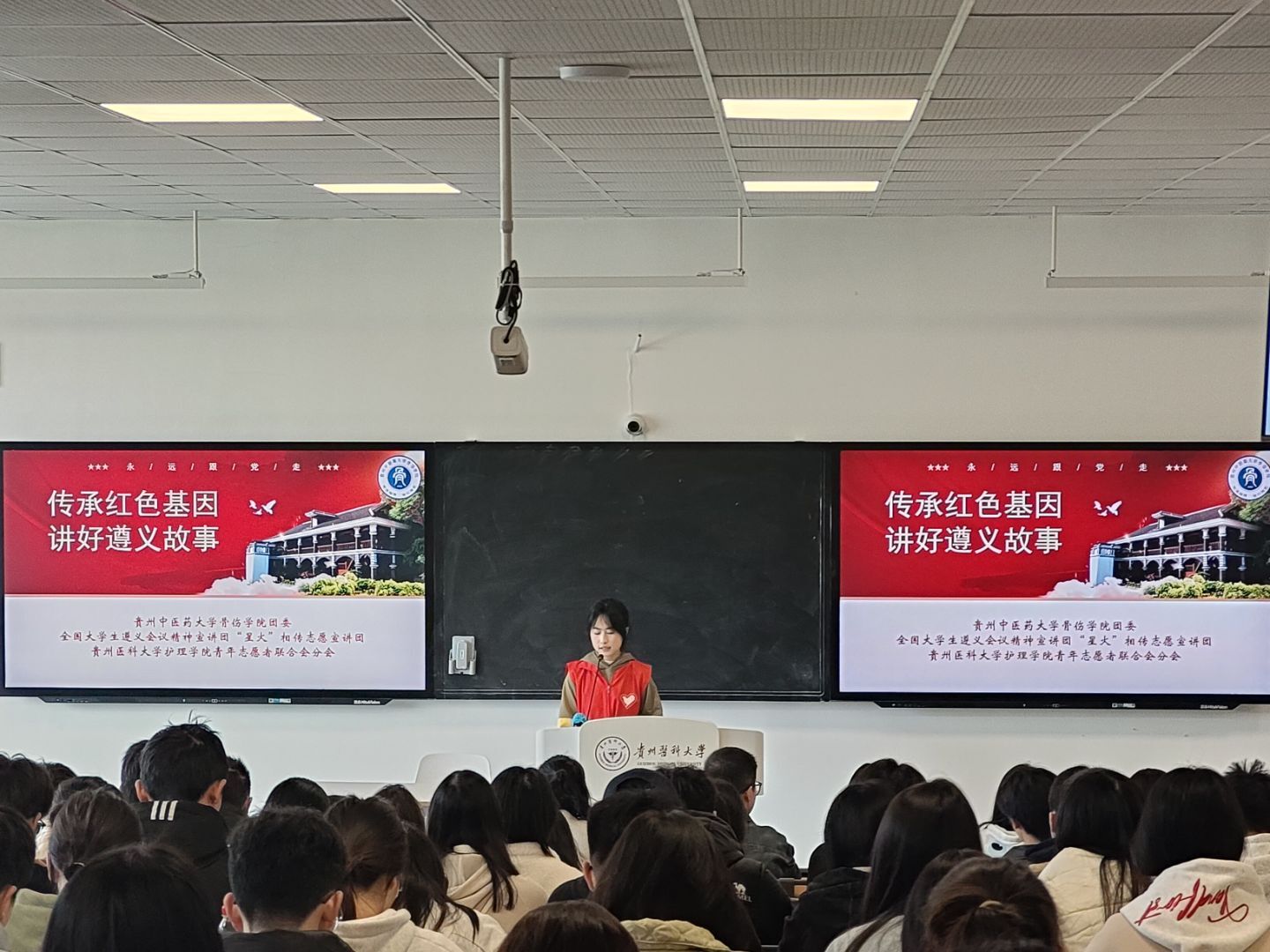 为让青年更好的铭记历史,传承红色基因,在新时代以先辈为榜样,担起民族复兴的大任。3月21日下午,美加墨世界杯官方网站学生各学生党支部联合贵州中医药大学骨伤学院“星火”相传志愿宣讲团在临床L109教室开展“传承红色基因,讲好遵义故事”的志愿宣讲暨支部联合主题党日活动。学院全体学生党员、入党积极分子参加了此次活动。学生第一党支部书记梁子豪主持会议,贵州中医药大学骨伤学院“星火”相传志愿宣讲团成员吕雍主讲。