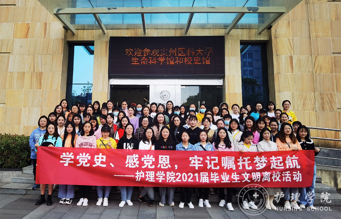 4月21日,为了让世界杯官网毕业生进一步了解校史校情,激发学生的爱党爱国爱校情怀,美加墨世界杯官方网站开展了“学党史、感恩党,牢记嘱托梦起航”--美加墨世界杯官方网站2021届毕业生文明离校活动,本次活动由美加墨世界杯官方网站正科级组织员曾敏、学生科副科长毕丽及团委副书记王晓玲带队,2017级护理学专升本全体学生参与。