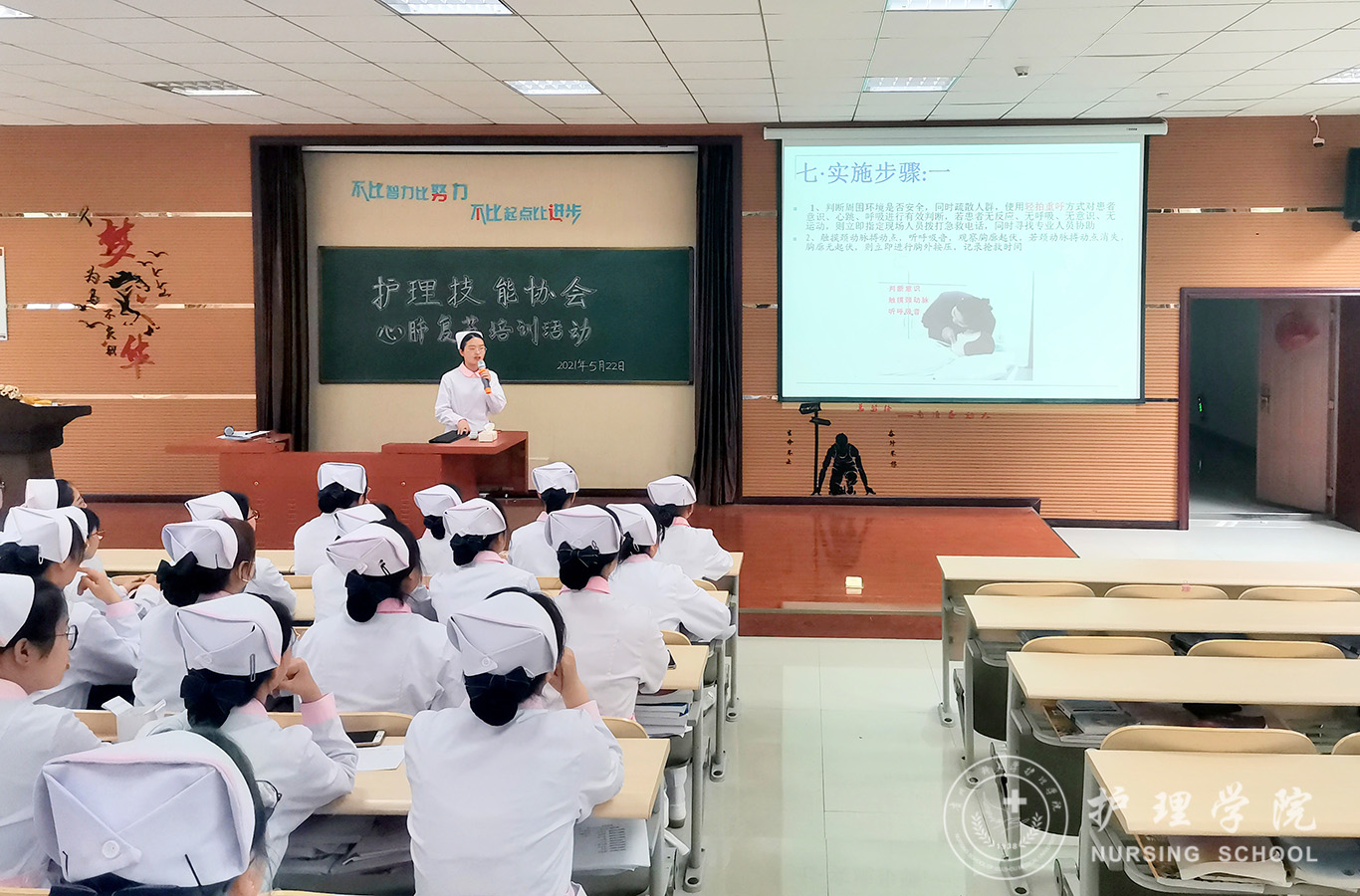 5月22日,为规范学生急救技能操作,提高应急抢救成功率,切实提高为人民群众办实事的能力,美加墨世界杯官方网站护理技能协会于百川楼1101教室及模拟实验室组织开展了心肺脑复苏术培训,本次培训邀请到了在第十届中国大学生医学技术技能大赛中荣获团体二等奖的2017级护理丙班欧阳成晶与2017级护理乙班黄虹久进行指导,护理技能协会成员及各班代表参加培训。