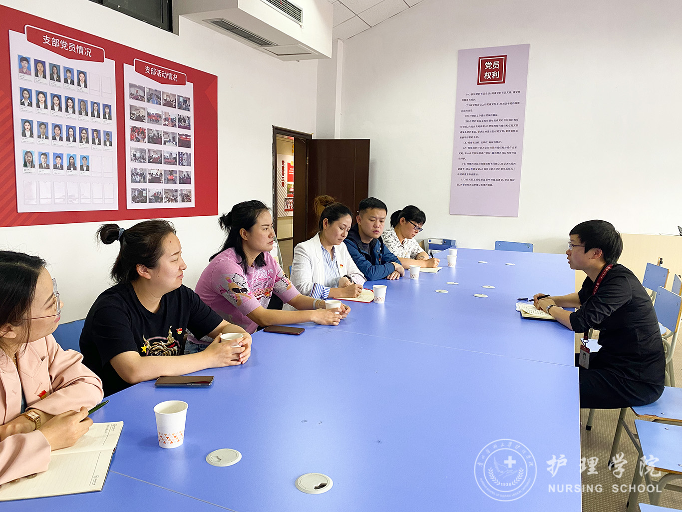 首先全体人员召开了交流座谈会。卿春对学院到访人员表示了热烈欢迎,张黎对本次到访的目的作了简要介绍,随后双方参会人员就当下党支部工作开展中的重点和难点问题进行了深度交流讨论。该院标准化规范化建设省级示范党支部(本科生第一党支部)书记赵里红向参会人员做了党支部建设经验分享。学院一行还参观了信息学院自主研发的“智慧党建”平台以及该院党建工作展示文化墙。最后张黎组织党支部书记重点学习了该院省级示范党支部的相关工作手册和资料汇编。