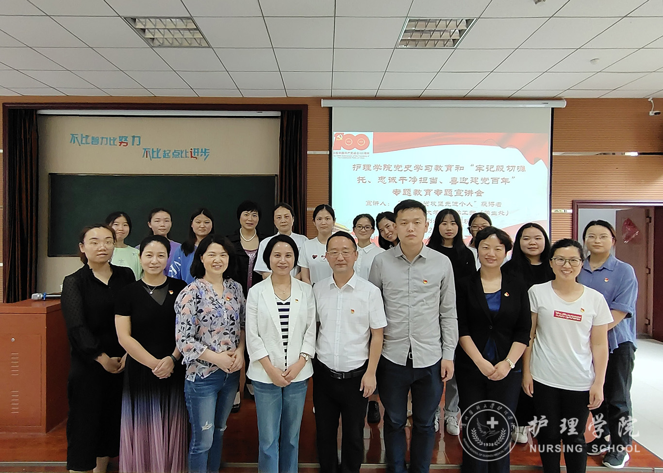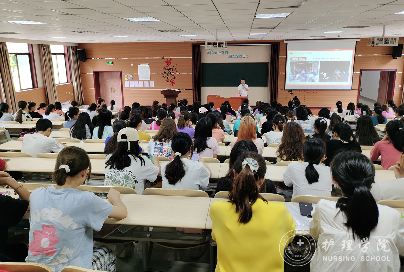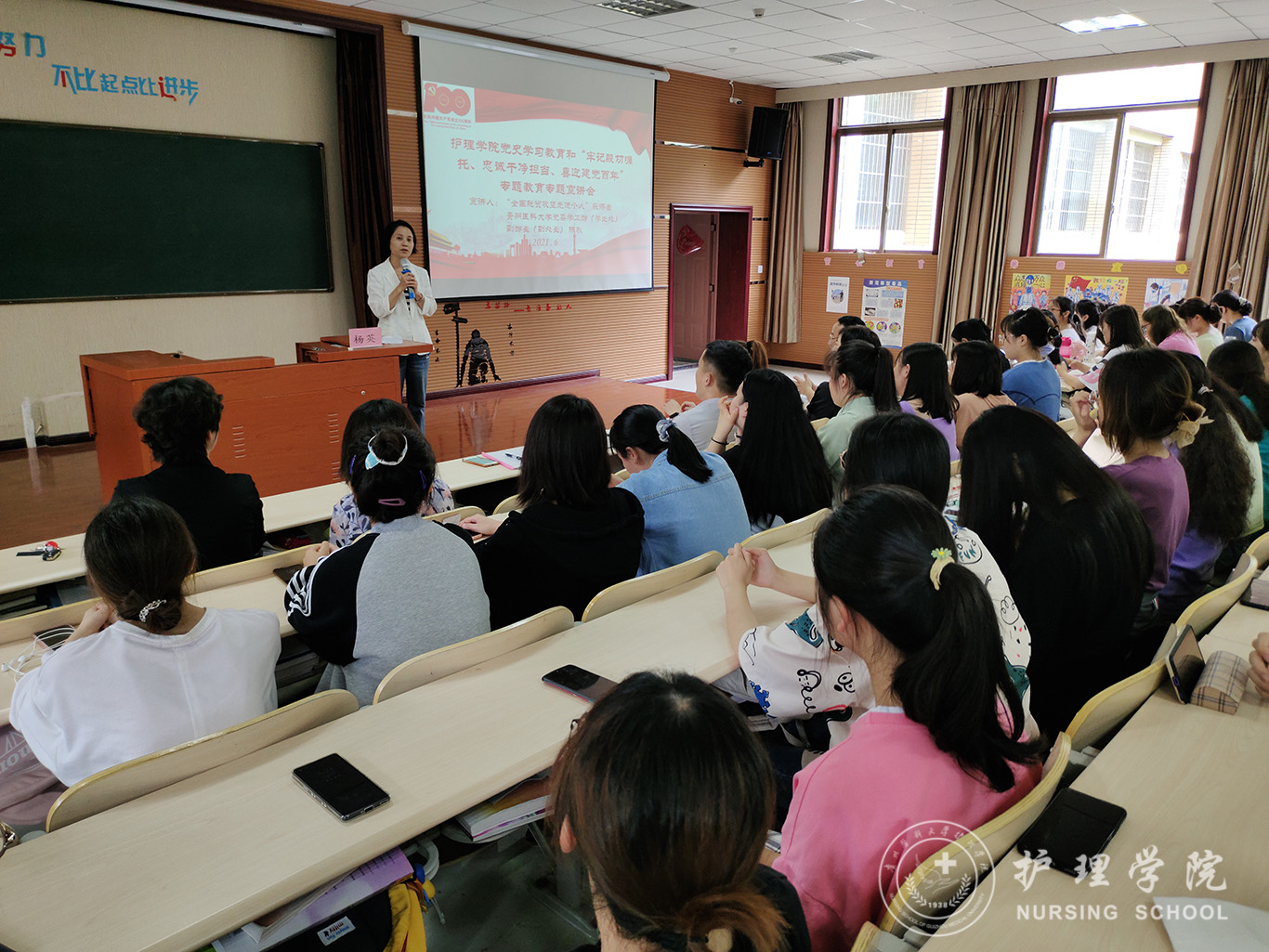 陈秋以《永葆初心、牢记使命,用奋斗的青春,为实现伟大中国梦不懈努力》为题,讲述了龙脚村脱贫攻坚概况和自己作为驻村干部带领当地群众脱贫攻坚的故事。宣讲会围绕脱贫工作的核心内容 “一达标、两不愁、三保障”“一宣六帮”等方面向同学们生动地讲述了脱贫攻坚一线工作,同学们深深感受到第一书记在龙脚村带领当地群众进行脱贫工作时“关关难过关关过”的艰辛,感受到了一线干部为实现脱贫攻坚对群众的无私付出。陈秋勉励同学们要学好党史,坚定听党话、跟党走的决心;要学好专业知识,扎实操作技能,树立良好的医德医风,传承和发扬南丁格尔“燃烧自己、照亮他人”的奉献精神。