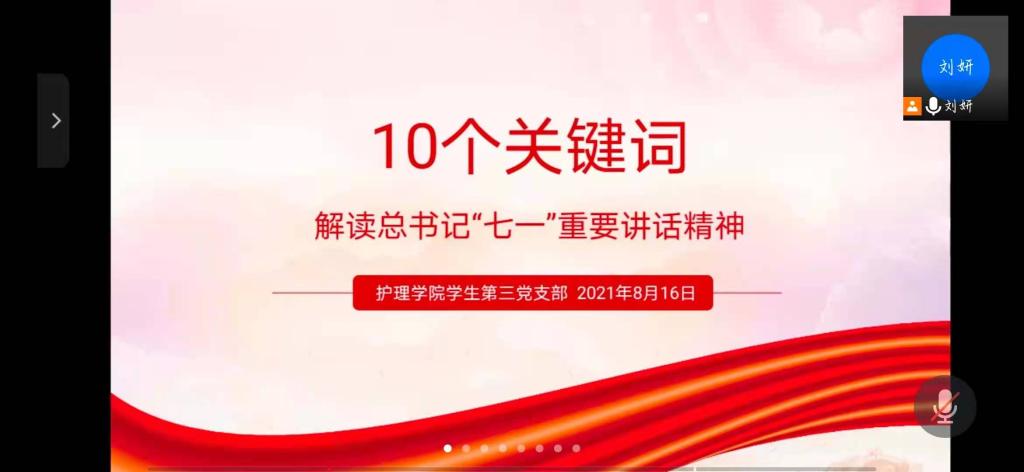 8月16日,为深入学习贯彻习近平总书记“七一”重要讲话精神,从党的百年奋斗历程中汲取奋进力量,引导新时代中国青年深刻领会和准确把握重要讲话精神的重大意义、丰富内涵,切实把思想和行动统一到讲话精神上来。美加墨世界杯官方网站学生第三党支部开展了习近平总书记“七一”重要讲话精神专题宣讲会,由美加墨世界杯官方网站学生第三党支部书记刘妍主讲,支部全体党员和入党积极分子参会。