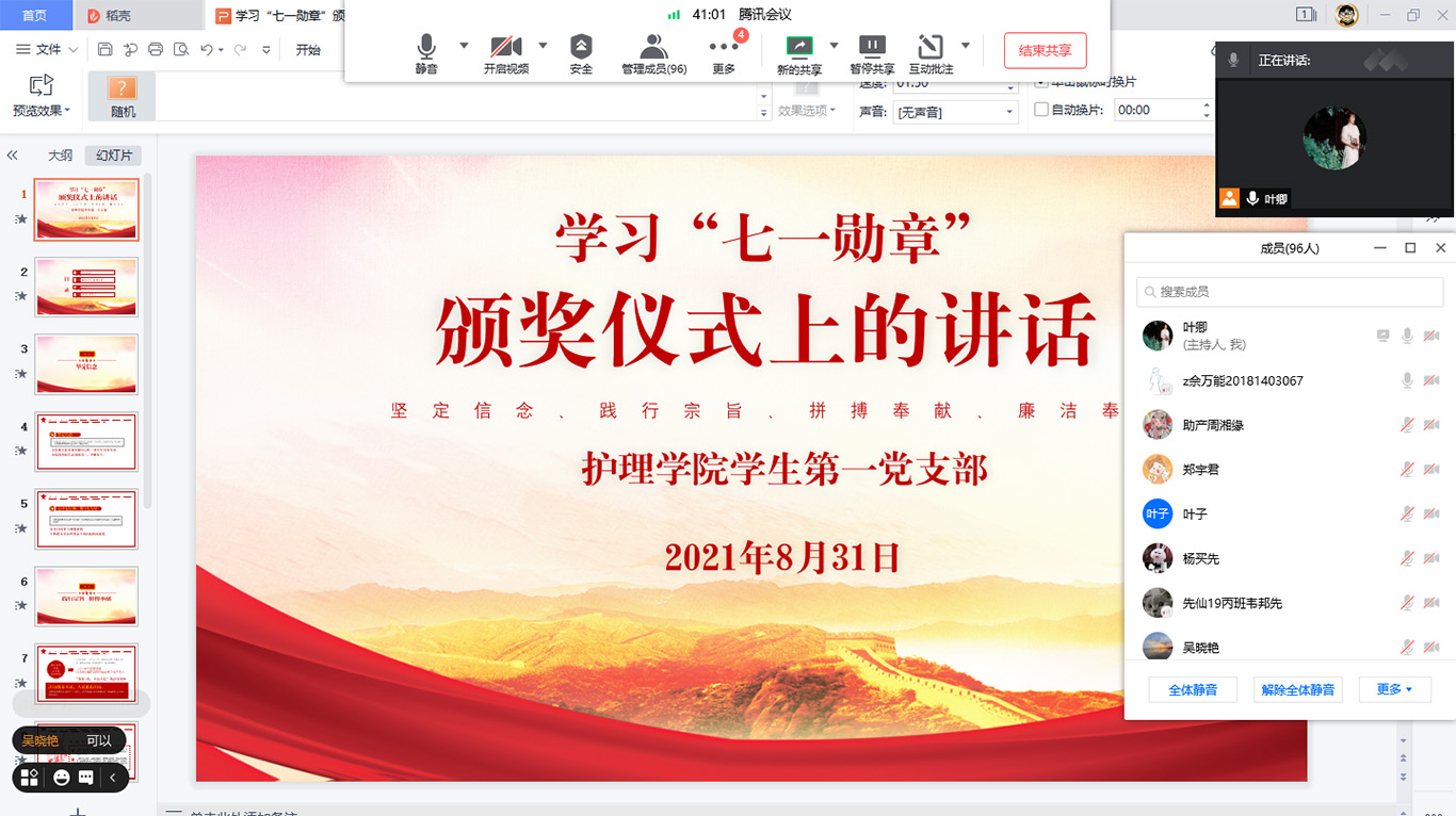 8月31日,为进一步弘扬功勋模范精神,引导广大学生党员学习先进典型“坚定信念、践行宗旨、拼搏奉献、廉洁奉公”的高尚品质和崇高精神。美加墨世界杯官方网站学生第一党支部开展学习“七一勋章”颁奖仪式重要讲话精神。会议由美加墨世界杯官方网站学生第一党支部书记杨叶卿主持,全体学生党员及入党积极分子通过线上形式参加会议。