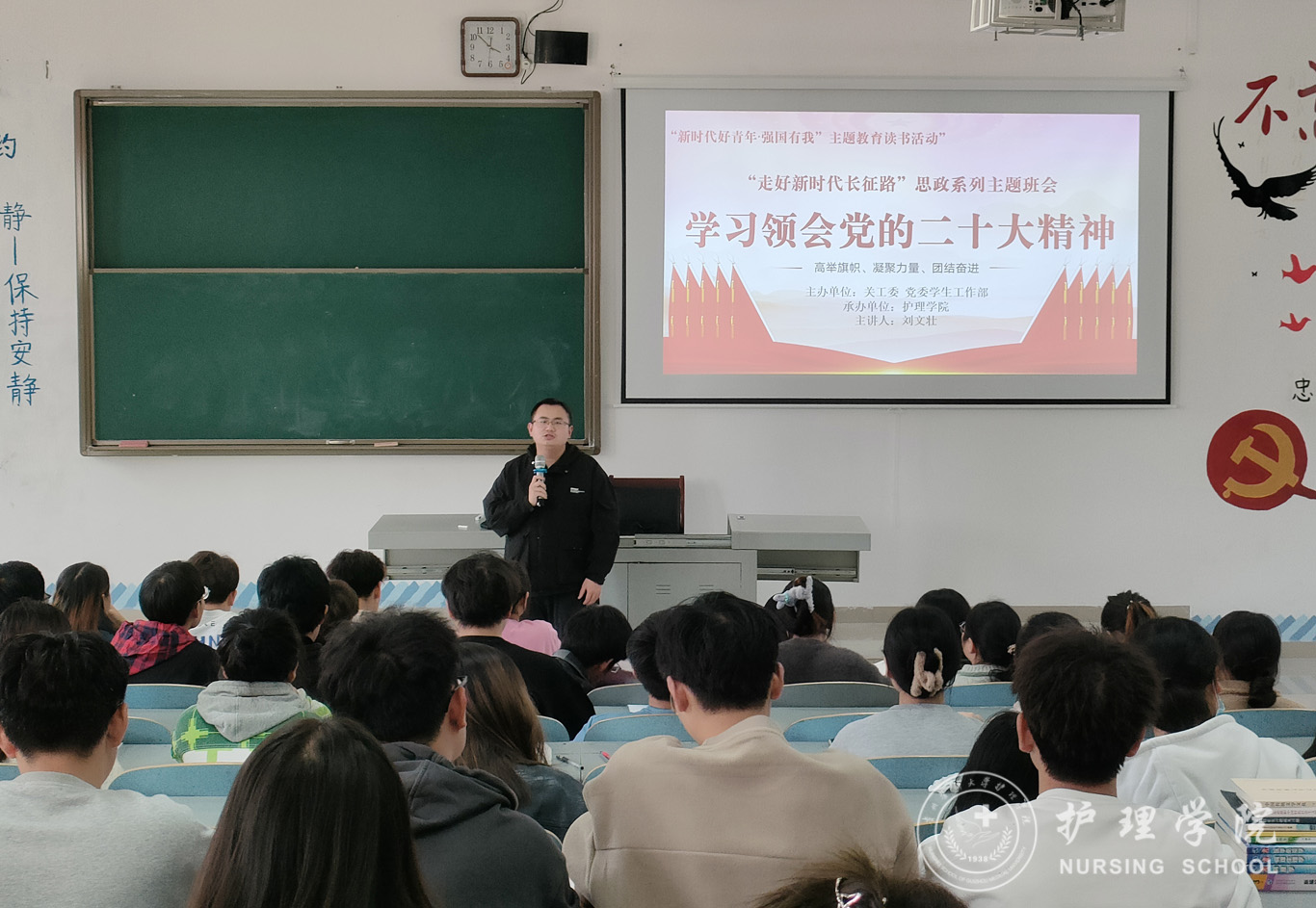 11月21日,为深入学习宣传贯彻中国共产党第二十次全国代表大会精神,用实际行动将党的二十大精神传达到班级中,护理学2021级5班召开“学习领会党的二十大精神”主题班会,班会由辅导员刘文壮主讲,班级全体同学参加。