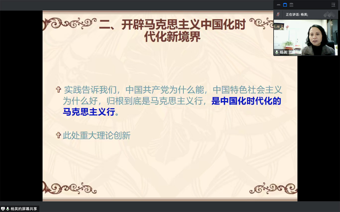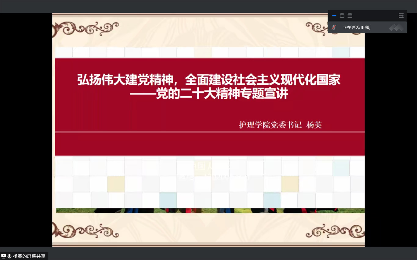 12月10日,为深入学习贯彻党的二十大精神,引导学生党员认真学习,领悟精神实质,美加墨世界杯官方网站党委书记杨英以“弘扬伟大建党精神,全面建设社会主义现代化国家”为主题在美加墨世界杯官方网站学生第一党支部宣讲党的二十大精神,会议由支部书记杨叶卿主持,全体支部党员、 入党积极分子通过腾讯会议参加本次宣讲。