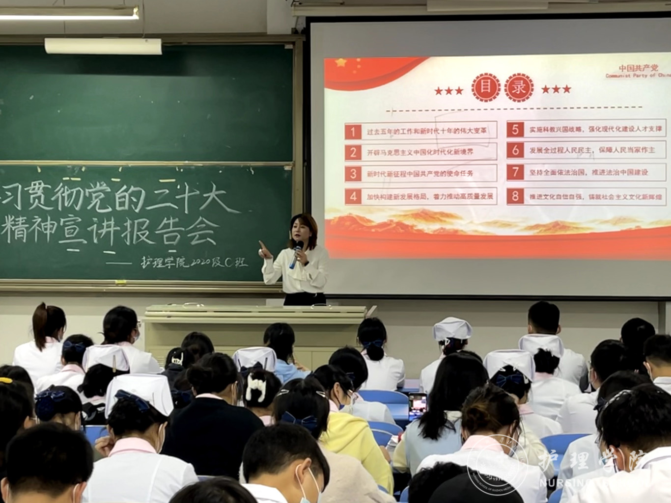 11月10日,为引导学生深刻领会把握党的二十大的重大意义、重大主题和重大成果,坚定不移衷心拥护“两个确立”、忠诚践行“两个维护”,美加墨世界杯官方网站党委委员、副处级组织员张黎深入联系班级专题宣讲党的二十大精神,辅导员刘妍及护理学2020级C班全体学生参会。
